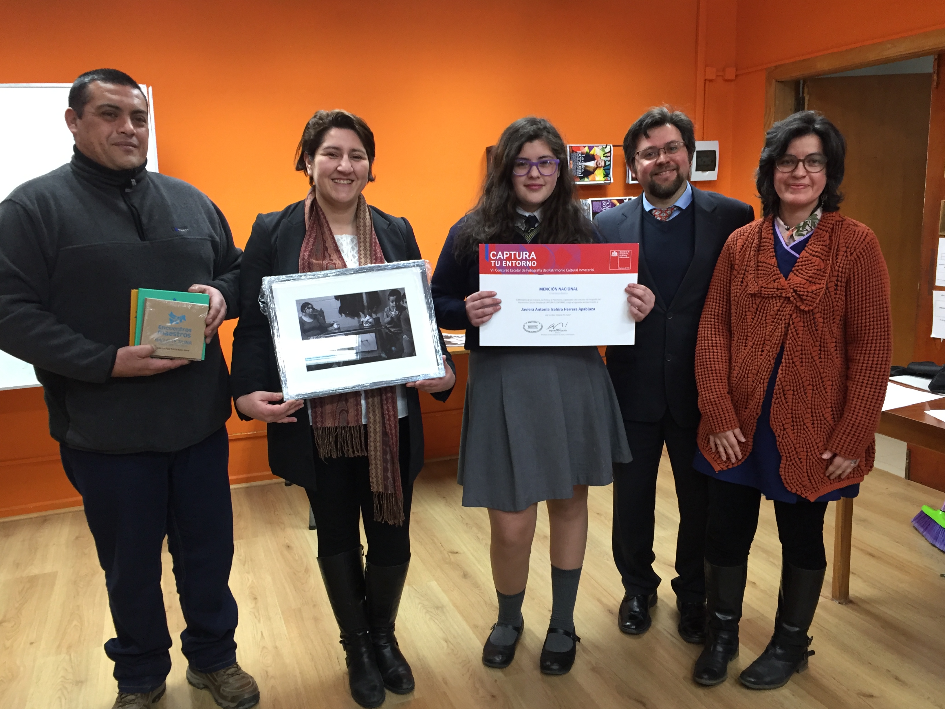 Acompañada de sus compañeros de curso, su papá y el director del Colegio Santa Teresa de los Andes, Javiera Herrera Apablaza recibió de manos de la seremi de Gobierno, Tatiana Fontecha el reconocimiento por la Mención Honrosa que recibió por haber participado del Concurso Nacional de Fotografía Patrimonial Inmaterial “Captura Tu Entorno”.
