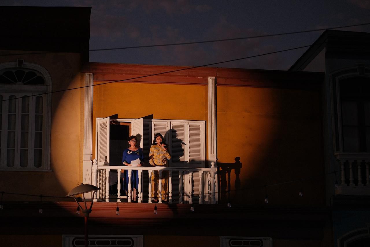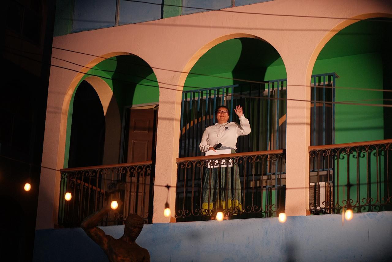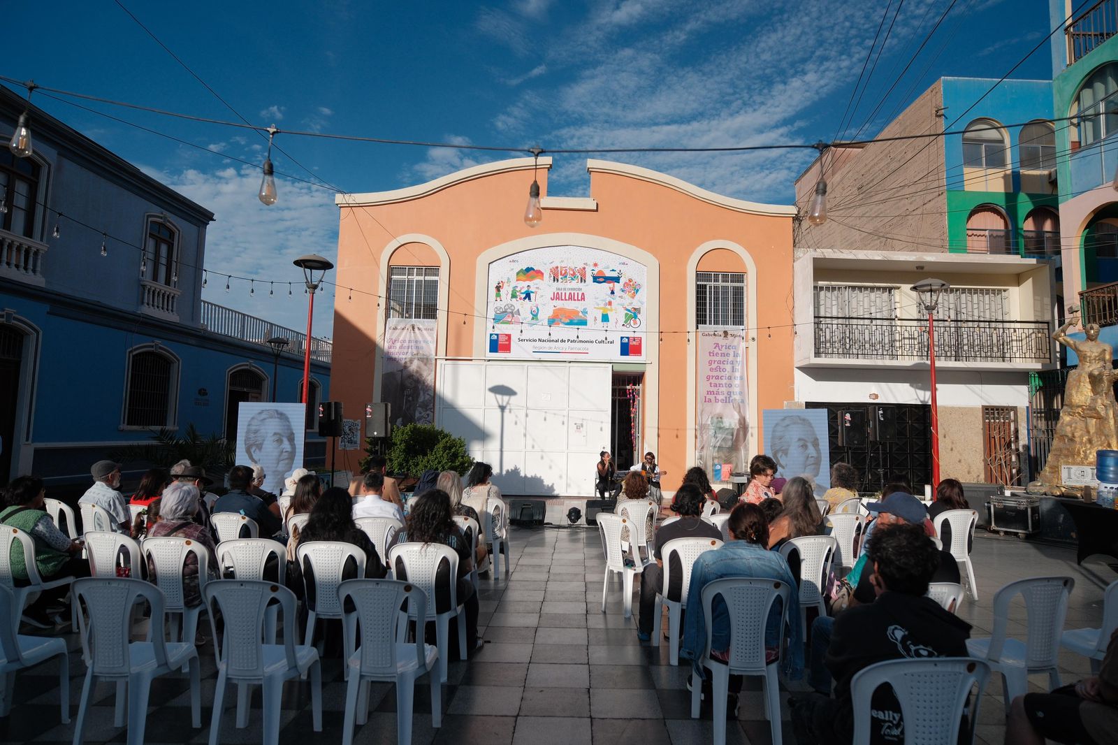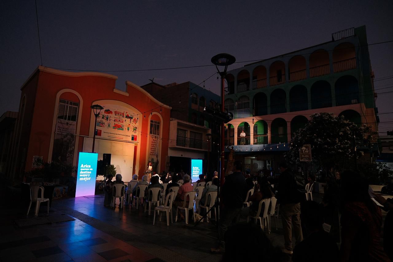 El acto artístico continuó con la presentación “Mujer, Hemisferio Humano” de Banda-Da, seguida por las interpretaciones de Susana Montecinos, Marcela Araya, Claudia Ojeda y María José Olivares, quienes se desplegaron desde distintos puntos de Plaza Grecia —como el Hotel Sotomayor, el balcón de la casa de Ariela González Yanulaque y el escenario central— para cantar y declamar los poemas La Pajita, Apegado a Mí, Miedo, Vergüenza, Balada, La Abandonada y Oración a la Maestra, cerrando con Carta a Arica, texto que Mistral dejó tras su paso por la ciudad en 1954.