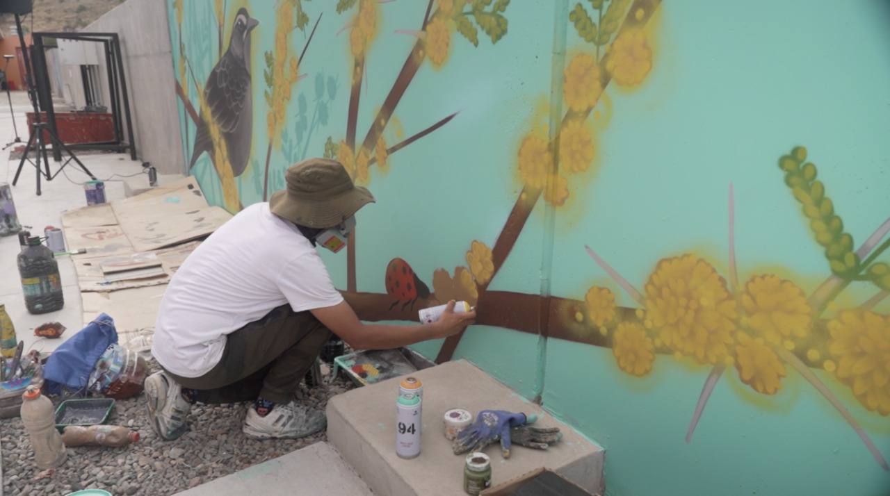 El artista local Luis Cáceres (alias Artek) plasmó en el recinto el trabajo de muralismo “Loica y Espino”, obra que busca concientizar y educar sobre la naturaleza local.