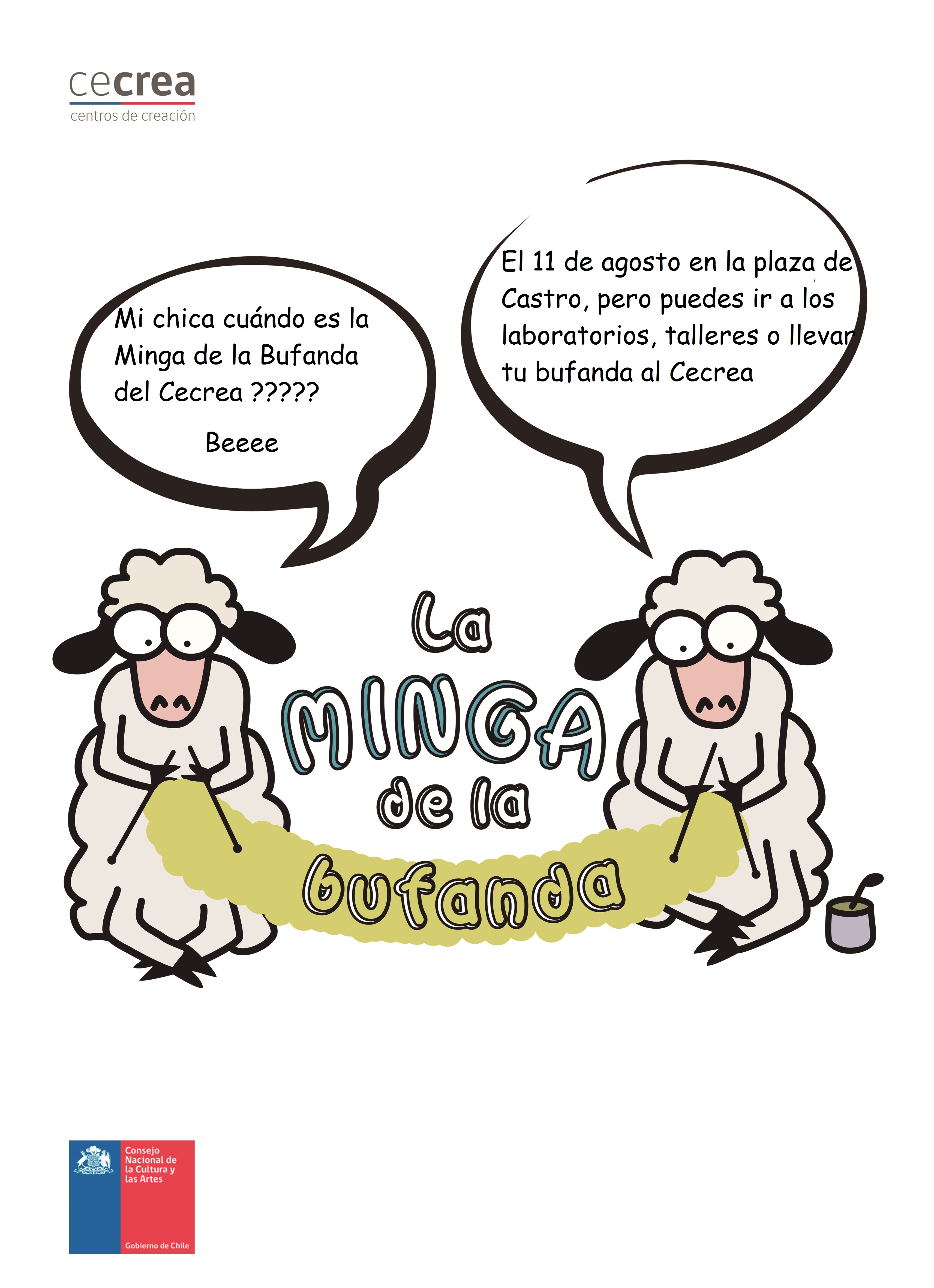 El equipo del Centro de Creación Artística CECREA Castro para niños, niñas y jóvenes han coordinado el desafío de la #MingadelaBufanda, que ha creado el Consejo de la Cultura y las Artes, a través de la residencia del artista español Miquel García, quien vino a generar un gran hito para Chiloé, tejiendo una bufanda que alcance los 500 metros y lograr el récord nacional de la bufanda más larga de Chile. Se está realizando un laboratorio y talleres en la sede actual de CECREA en el Departamento de Cultura del Municipio de Castro y en las intervenciones ciudadanas realizadas en distintos puntos de la ciudad como la Biblioteca Pública o la Feria Lillo.