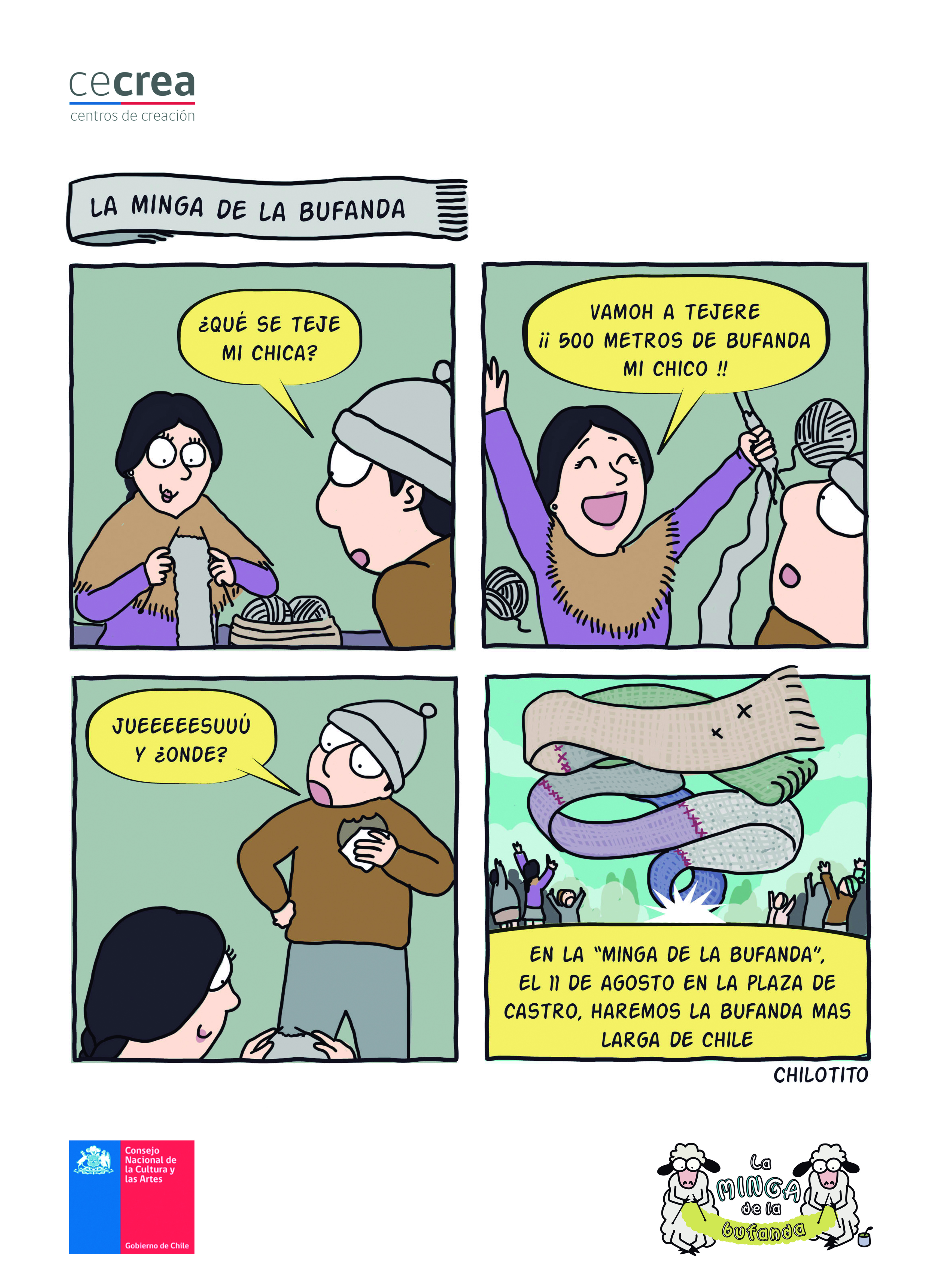 El equipo del Centro de Creación Artística CECREA Castro para niños, niñas y jóvenes han coordinado el desafío de la #MingadelaBufanda, que ha creado el Consejo de la Cultura y las Artes, a través de la residencia del artista español Miquel García, quien vino a generar un gran hito para Chiloé, tejiendo una bufanda que alcance los 500 metros y lograr el récord nacional de la bufanda más larga de Chile. Se está realizando un laboratorio y talleres en la sede actual de CECREA en el Departamento de Cultura del Municipio de Castro y en las intervenciones ciudadanas realizadas en distintos puntos de la ciudad como la Biblioteca Pública o la Feria Lillo.