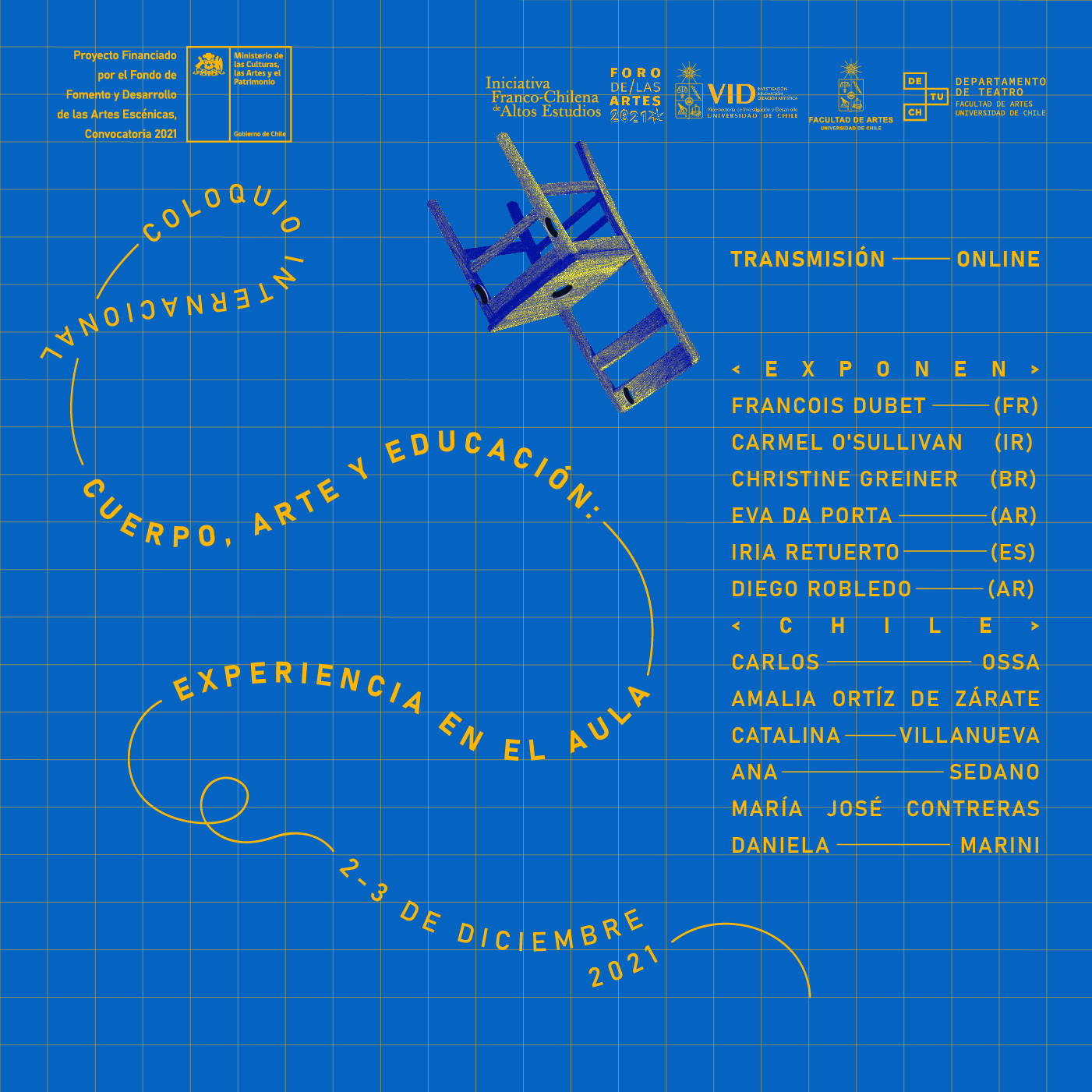 “Cuerpo, Arte y Educación: Experiencia en el Aula” se realizará en dos jornadas los días jueves 2 y viernes 3 de diciembre de 2021 en bloques de 9:30 a 11:40 y de 14:45 a 16:40 hrs. Tendrá una modalidad virtual y será transmitido por streaming a través de redes sociales de DICREA y del DETUCH.