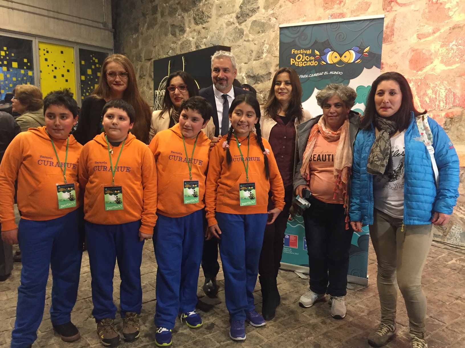 Un momento de especial emoción se vivió cuando niños y niñas de la Escuela Rural Curahue de Chiloé, Sebastián Miranda, Christopher Pavéz, Alejandro Muñoz y Britney Comicheo, de cuarto y sexto básico, subieron al escenario junto a su profesora Noelia García, para presentar y estrenar dos de las películas que se realizaron en el marco de los talleres de cine que impartió Ojo de Pescado en comunidades educativas de Chiloé: los cortometrajes “Se pierde el oro chilote” y “Los animales salvan el día”.