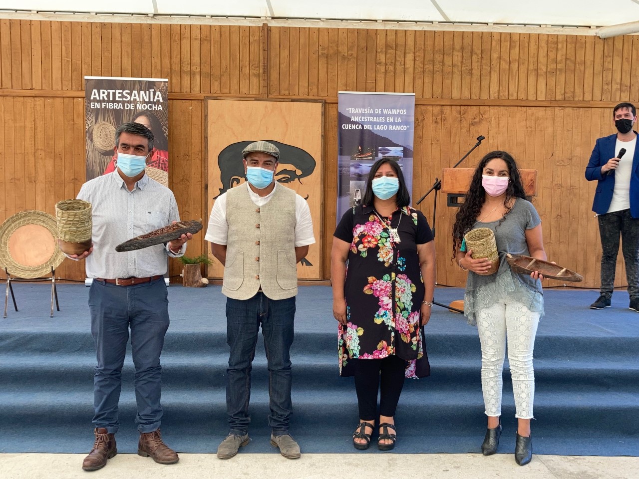 En una ceremonia realizada en la carpa Pasos de Neruda, los artesanos Víctor Hugo Bustamante y Marcela Meza Panguilef realizaron el acto de cierre de sus proyectos financiados por el Ministerio de las Culturas a través del Fondart Regional, convocatoria 2021. La actividad contó con la presencia de la seremi de Culturas Los Ríos Gabriela Avendaño, el alcalde de Futrono Claudio Lavado y el concejal Sergio Solís.