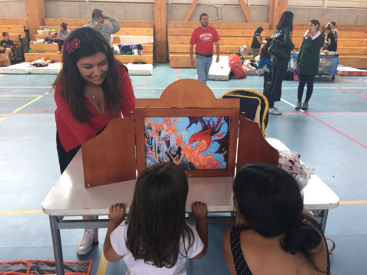 Niños y niñas damnificados por el incendio que afectó a poblaciones de la parte alta del cerro Playa Ancha en Valparaíso, participaron de las presentaciones de cuentacuentos, teatro de papel kamishibai y del punto de lectura que dispuso este martes el Consejo Regional de la Cultura y las Artes de Valparaíso en el albergue ubicado en el Polideportivo Playa Ancha.