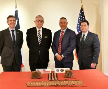 En una ceremonia realizada este jueves 10 de febrero en la Embajada de Chile en Washington D.C., Estados Unidos, y con la presencia del Embajador Alfonso Silva y de representantes del Departamento de Estado y del Buró Federal de Investigaciones (FBI), se concretó la devolución de una serie de bienes patrimoniales chilenos que fueron interceptados a una casa de remates de la ciudad de Filadelfia, por parte de agentes del gobierno estadounidense, tras la reclamación oficial realizada por nuestro país, a través del Ministerio de Relaciones Exteriores.