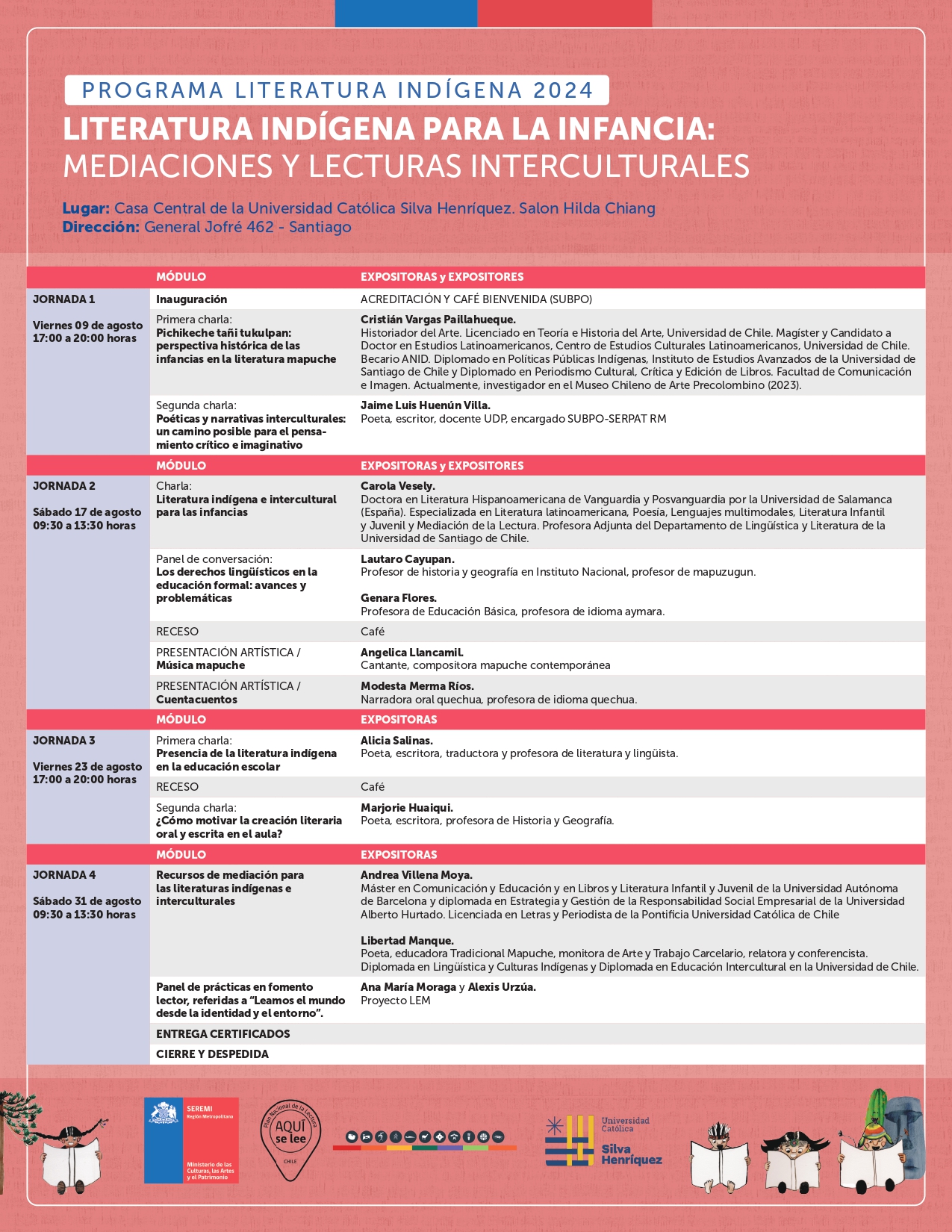 Este ciclo, organizado por el Plan de Lectura de la Seremi de las Culturas, las Artes y el Patrimonio en colaboración con la Subdirección de Pueblos Originarios de la Región Metropolitana, busca acercar a mediadores, docentes y agentes culturales al rico patrimonio literario de los pueblos originarios de Chile.