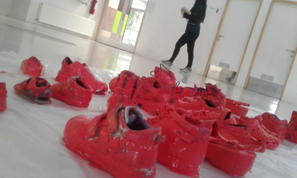 La puesta en escena consiste en la instalación de zapatos rojos de mujer, que han sido donados por la comunidad y que en su pintado han colaborados niñas y niños de los jardines infantiles Laguna Azul, Caperucita Roja, Bambi y Juan Ruiz Mancilla. La instalación, que sumará más de 100 pares de calzados, pretende convertirse en un llamado de atención respecto de los casos de feminicidio aludiendo a la ausencia de aquellas víctimas.