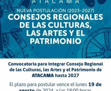 La región de Atacama cuenta con 3 cupos para integrar el Consejo Regional de las Culturas, las Artes y el Patrimonio hasta el 2027, y las postulaciones para proveerlos estarán abiertas hasta el 19 de agosto en la página www.cultura.gob.cl/convocatorias.
