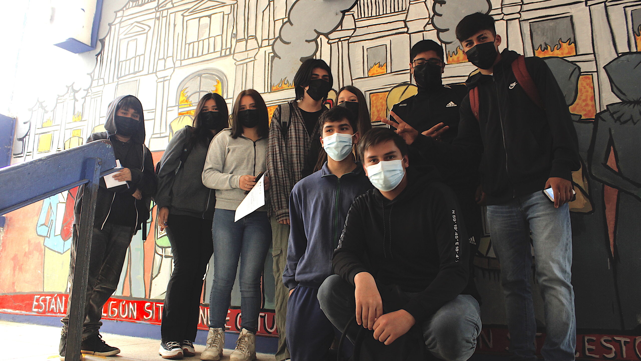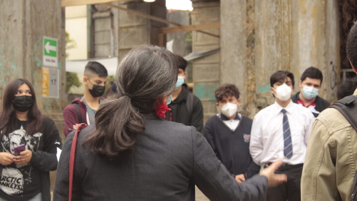 Posterior a la visita guiada, se generó una zona de contacto donde cada grupo tuvo la posibilidad de conocer y dialogar con los y las creadoras seleccionadas, instancia que estuvo definida por el cruce de miradas personales en torno a cada obra, los itinerarios de vida de los artistas y las dimensiones afectivas que se desprendieron del visionado colectivo. Estuvieron presentes las artistas Claudia Sierralta, Eugenia Betanzo, junto con Eugenio Salas, quienes compartieron parte de sus procesos creativos y proyectos políticos detrás de cada obra, especialmente, respondiendo a las preguntas de los y las jóvenes que demostraron un pensamiento crítico en torno a cómo nos relacionamos con nuestro patrimonio urbano y enfrentamos los cambios sociales y culturales en el presente. La conversación, además, giró hacia la importancia que tienen las artes en el escenario educativo y desarrollo integral de las personas.