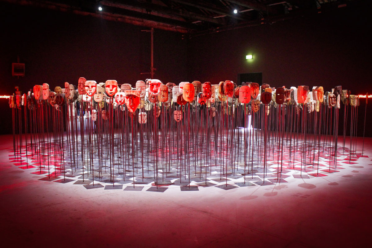 Las máscaras fueron realizadas una a una por cuarenta artesanos mapuches que habitan en distintas comunidades en el sur de Chile, a partir de una relación directa que estableció el artista con cada uno de ellos.