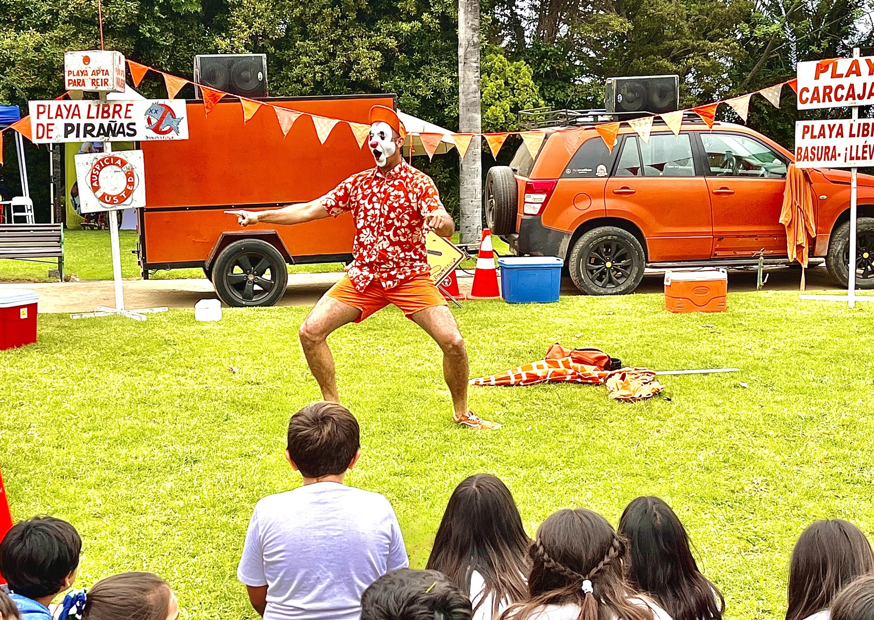 El cierre de las jornadas solidarias encabezadas por el mimo y su equipo culminaron en el Palacio Presidencial Cerro Castillo (Viña del Mar), donde el personaje oriundo de Valparaíso presentó su espectáculo callejero “Un Verano naranja” ante las niñas, niños y adolescentes que son parte de la Escuela Abierta que funciona en el recinto.