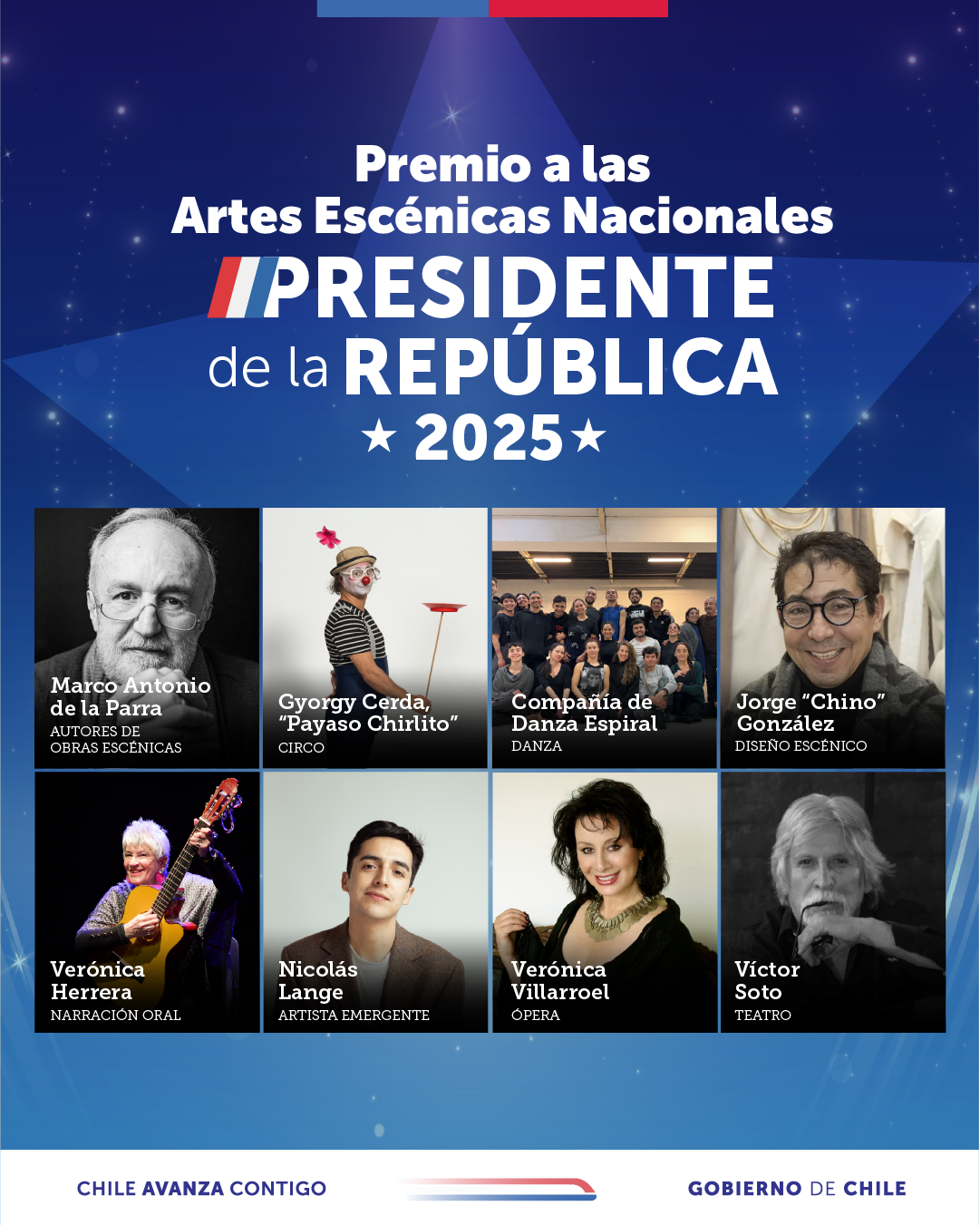 Por cuarto año, el Consejo Nacional de Artes Escénicas del Ministerio de las Culturas, las Artes y el Patrimonio dio a conocer a los ganadores del Premio a las Artes Escénicas Nacionales Presidente de la República, que reconoce la excelencia, creatividad y labor de artistas, elencos y/o compañías que han aportado al desarrollo del sector desde diversas disciplinas.
