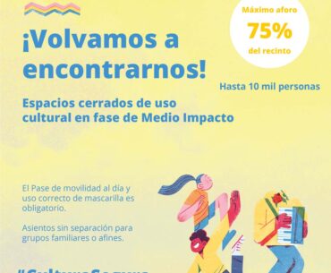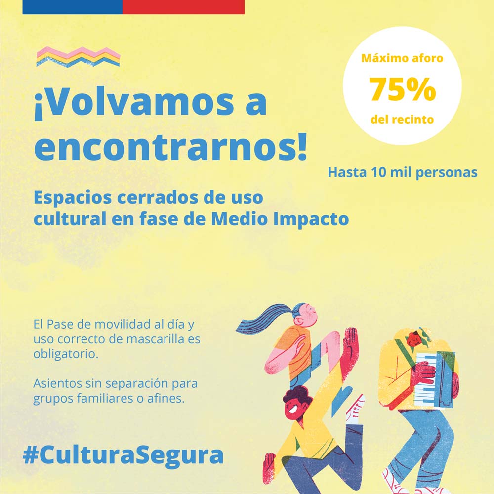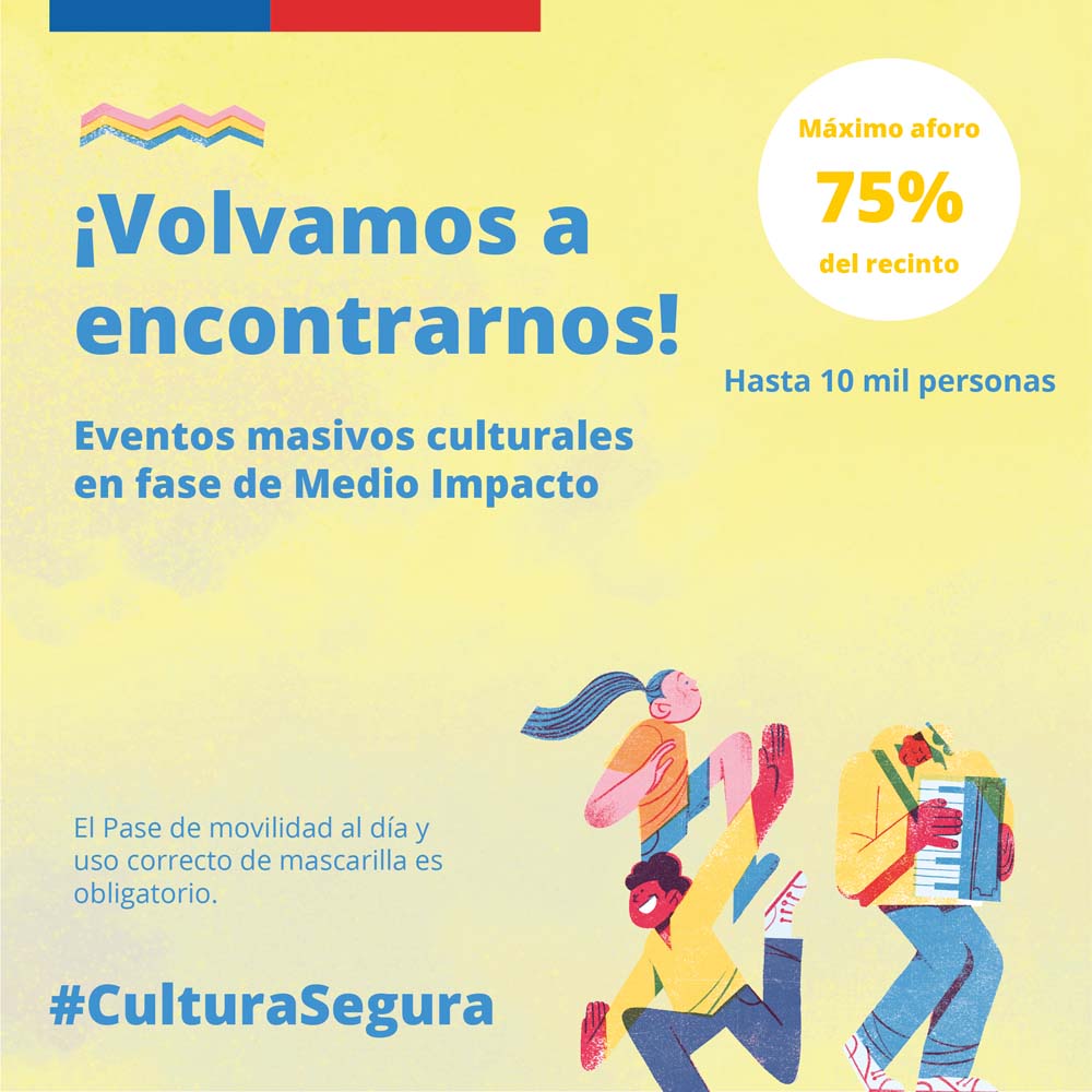 En las comunas en Fase de Medio Impacto Ambiental, o Fase Amarilla, el aforo total será de hasta 10.000 asistentes en espacios abiertos o cerrados y en eventos masivos culturales. En espacios de uso cultural con asientos fijos no podrá superarse el 75% del aforo habitual del recinto. En ambos casos, siempre se deberá respetar el distanciamiento físico definido por esta fase, que corresponde a 1 metro de distancia entre las personas, a excepción de los grupos familiares o de afinidad que hayan comprado o solicitado asientos contiguos en recintos con butacas fijas.