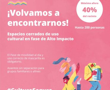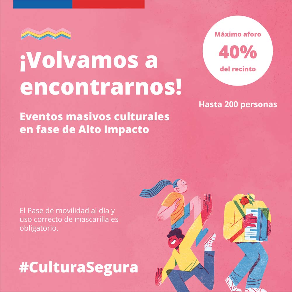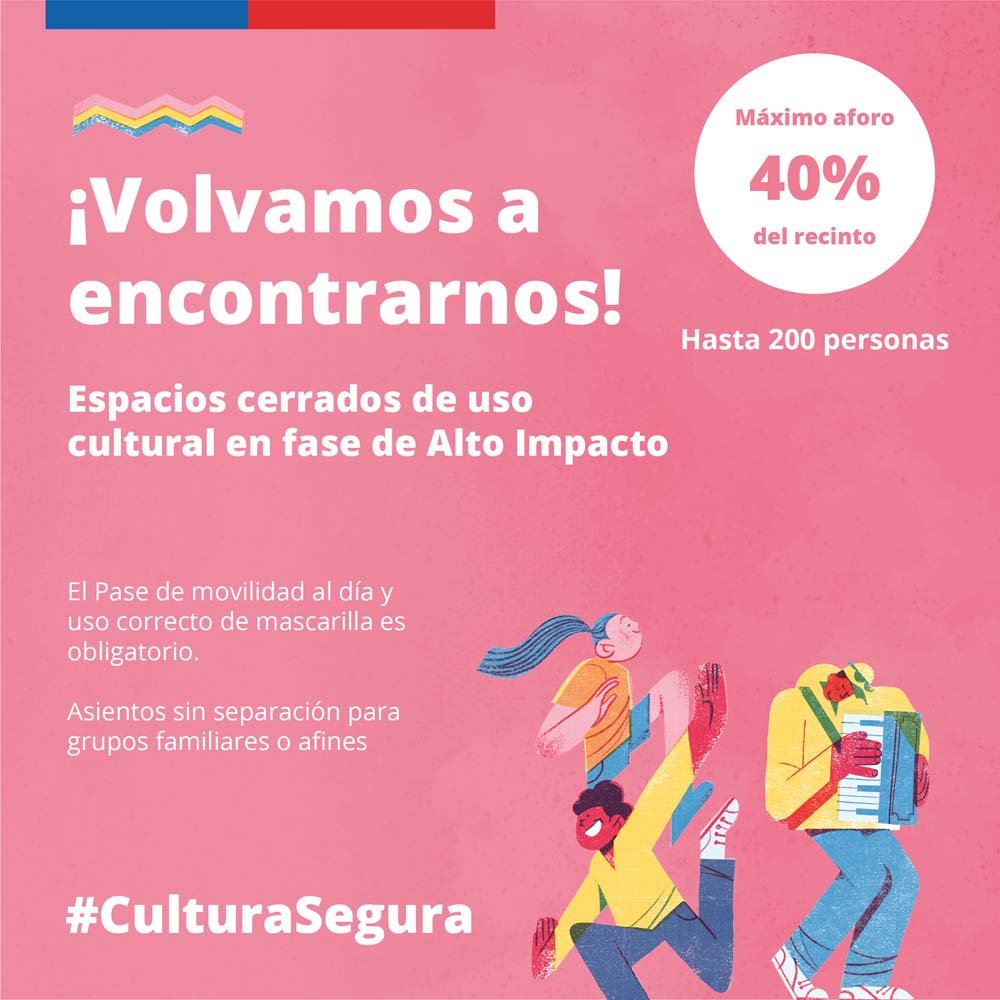 Para las comunas que se encuentren en Fase de Alto Impacto Sanitario, o Fase Roja, el aforo máximo permitido será de hasta 200 personas en los espacios cerrados de uso cultural y también en eventos masivos. Esta capacidad no podrá superar el 40 por ciento del aforo habitual del recinto. En ambiente abierto o cerrado, se debe respetar el distanciamiento físico definido por esta fase, que en este caso corresponde a 1,5 metros de distancia entre las personas, a excepción de los grupos familiares o de afinidad que hayan comprado o solicitado asientos contiguos en recintos con butacas fijas.