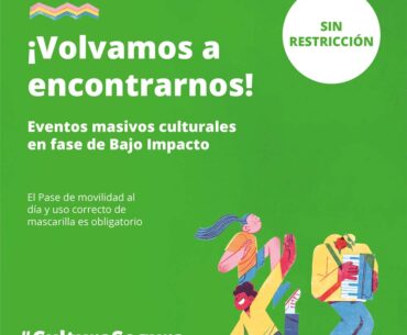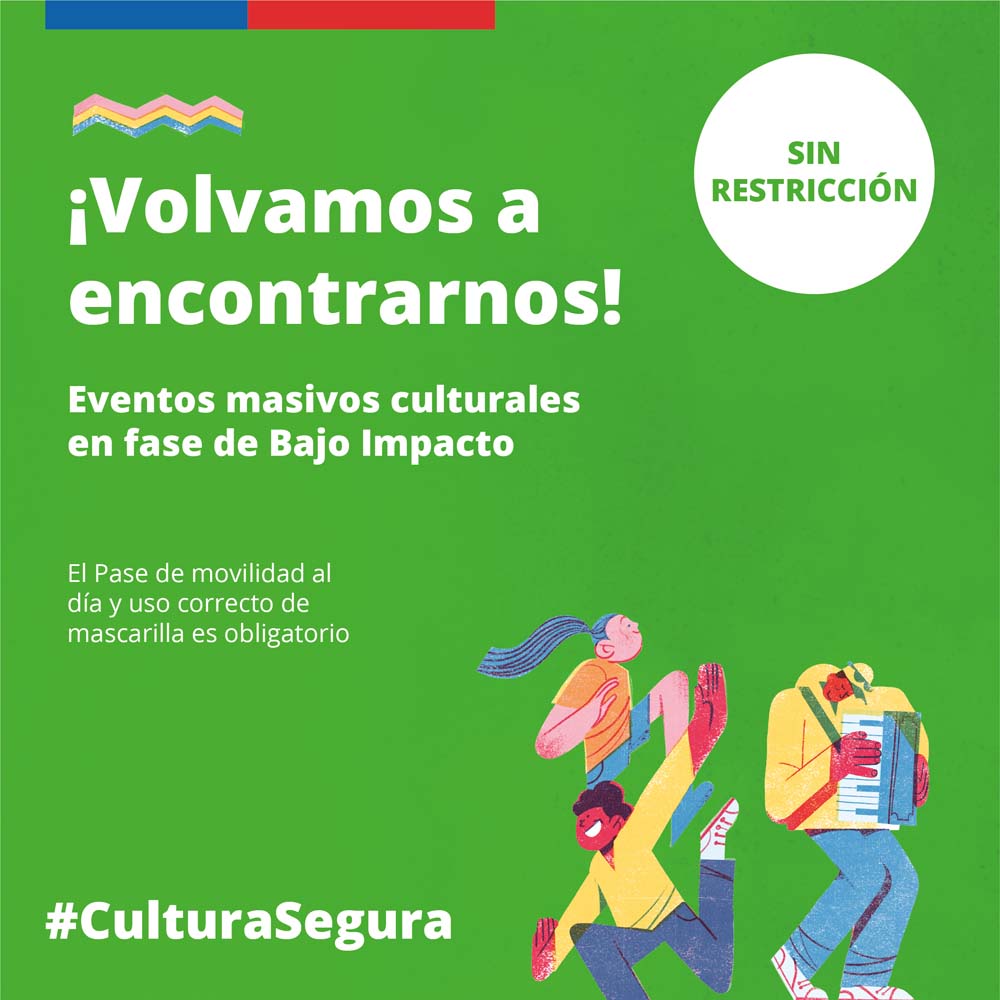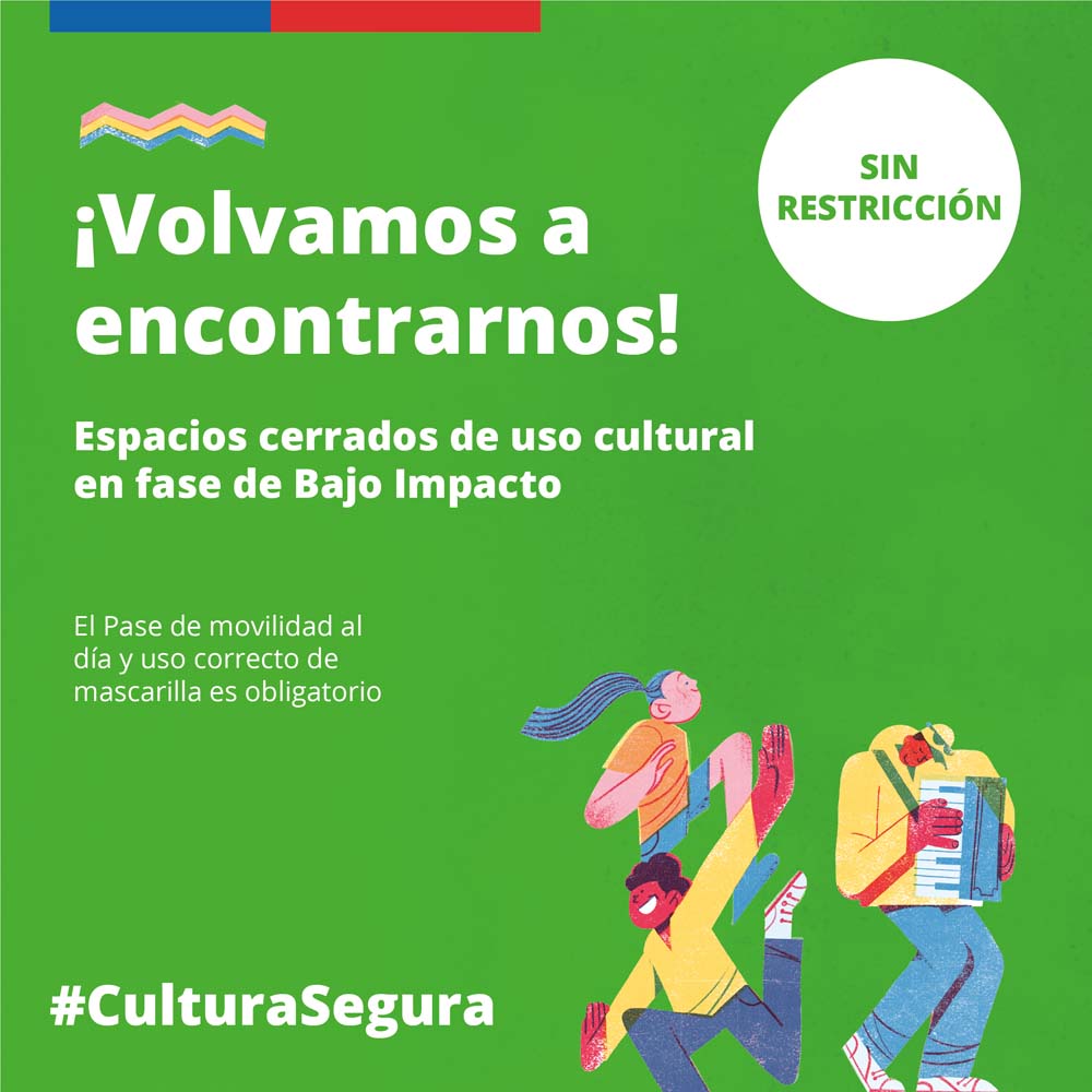En el caso de las comunas que se encuentran en Fase de Bajo Impacto Sanitario, o Fase Verde, el aforo es de un cien por ciento en espacios cerrados de uso cultural, así como también en los eventos masivos culturales. En ambos casos el uso de mascarilla es obligatorio.