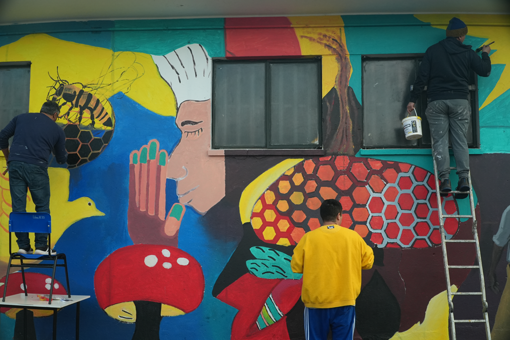 Un mural diseñado y pintado por internos fue la obra final del proceso formativo dictado por los artistas Carlos Rivera y Mario Cuevas, como parte del programa Visitas Artísticas del Fondart, un proyecto colaborativo entre el Ministerio de las Culturas, Gendarmería de Chile y la Universidad Metropolitana de Ciencias de la Educación.