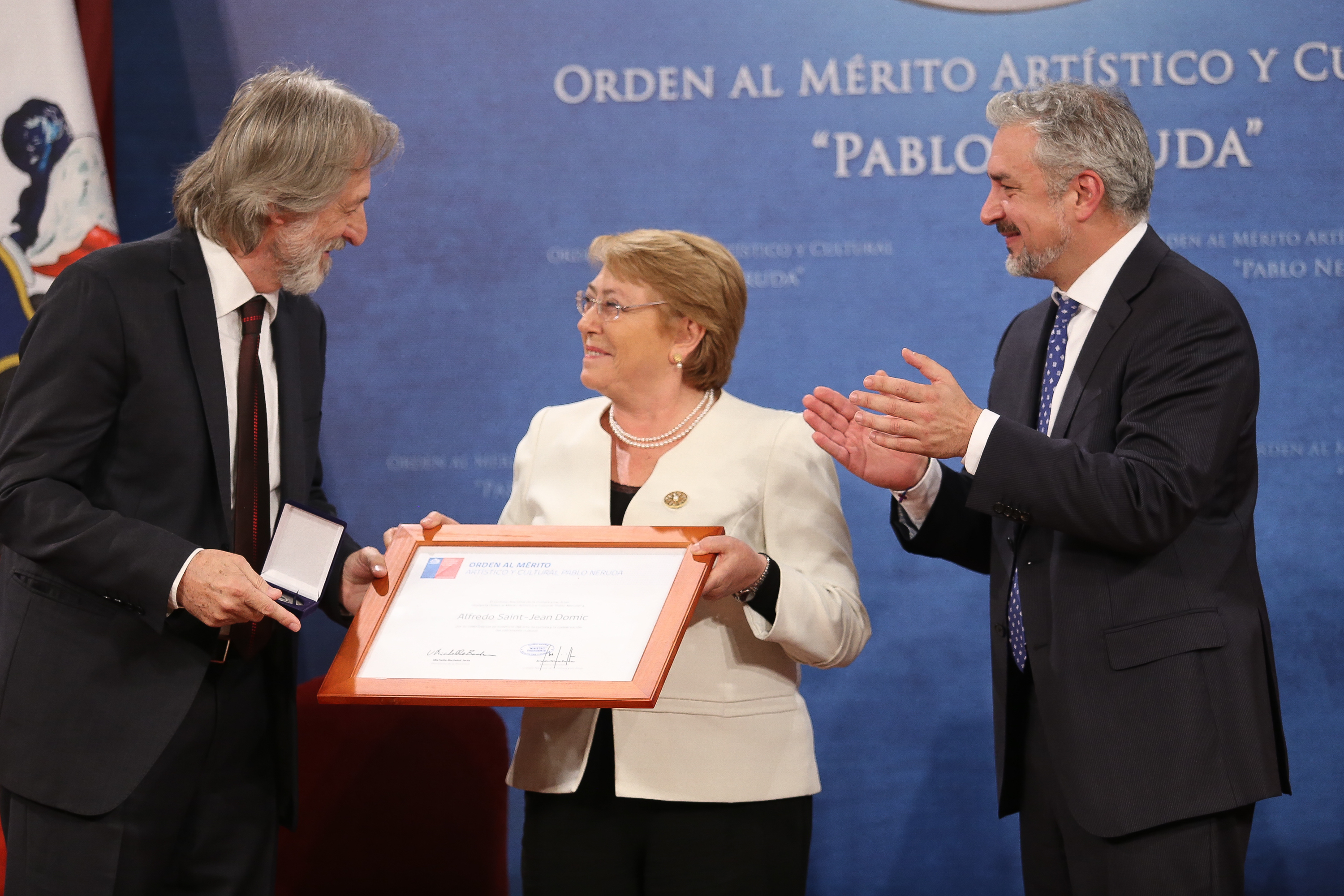 La Presidenta Michelle Bachelet, junto al Ministro de Cultura, Ernesto Ottone, recibieron este miércoles en el Palacio de La Moneda a Alfredo Saint-Jean Domic, promotor y gestor con más de cincuenta años de trayectoria, quien por su dedicación al quehacer cultural en Chile recibió la Orden al Mérito Artístico y Cultural Pablo Neruda, la máxima distinción que entrega el Consejo Nacional de la Cultura y las Artes.