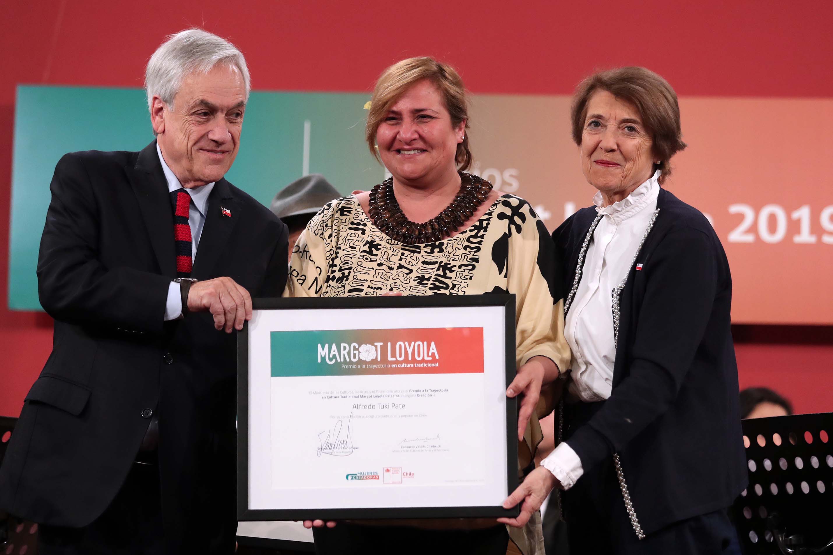 El presidente Sebastián Piñera, acompañado por la ministra de las Culturas, las Artes y el Patrimonio, Consuelo Valdés, entregó este viernes el Premio a la Trayectoria en Cultura Tradicional Margot Loyola Palacios 2019 a Radomiro Huanca y Alfredo Tuki Pate (representado por su hija), como parte de las actividades del Día Nacional de la Cultura Tradicional y Popular, fecha escogida precisamente para honrar el nacimiento de la folclorista chilena.