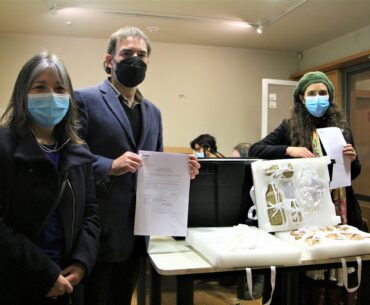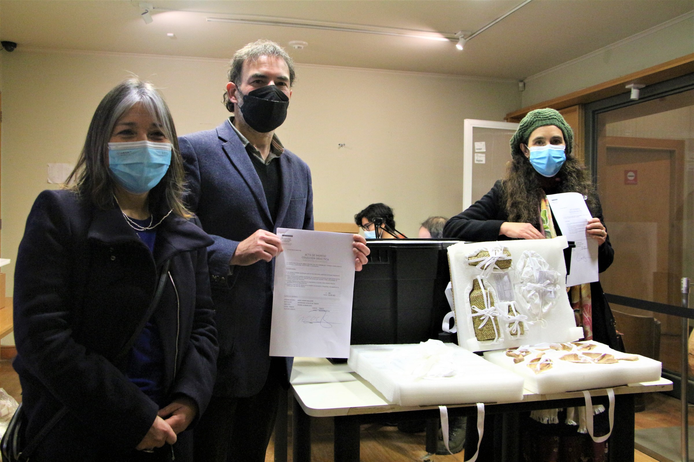 La seremi de las Culturas, las Artes y el Patrimonio Jeannette Paillan y la decana de la Facultad de Arquitectura, Arte y Diseño de la Universidad Católica de Temuco Marés Sandor entregaron simbólicamente la “Colección de artesanía regional de La Araucanía” al Museo Regional, que será su custodio y que estuvo representado por su director Miguel Chapanoff.