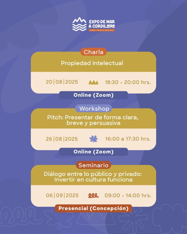 El ecosistema creativo del Biobío ya se prepara para una nueva versión de la ya tradicional Expo “De Mar a Cordillera”, que se realizará en diciembre de este año por dos días consecutivos. Y como antesala, la Seremi de las Culturas, las Artes y el Patrimonio de la Región del Biobío abrió las inscripciones para una serie de talleres gratuitos destinados a artistas, gestores, cultores y trabajadores culturales de toda la región, en alianza con la Secretaría Ejecutiva de Economía Creativa y la Escuela de Diseño de la Universidad del Bio-Bío.