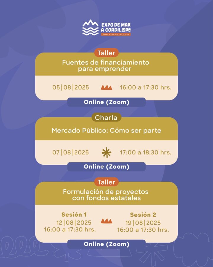 Durante el segundo semestre de 2025 se desarrollará un completo plan de formación dirigido a agentes culturales y creativos, que contempla talleres, workshops y charlas informativas en modalidad online y presencial. Entre las actividades destacadas se encuentran los talleres “Fuentes de financiamiento para emprender”, “Formulación de proyectos con fondos estatales” y “Herramientas para postulación a Fondart Regional”, todos liderados por expertas en emprendimiento, formulación de proyectos y gestión cultural. También se realizará el workshop “Presentar de forma clara, breve y persuasiva”, enfocado en mejorar habilidades comunicativas y técnicas de pitch.