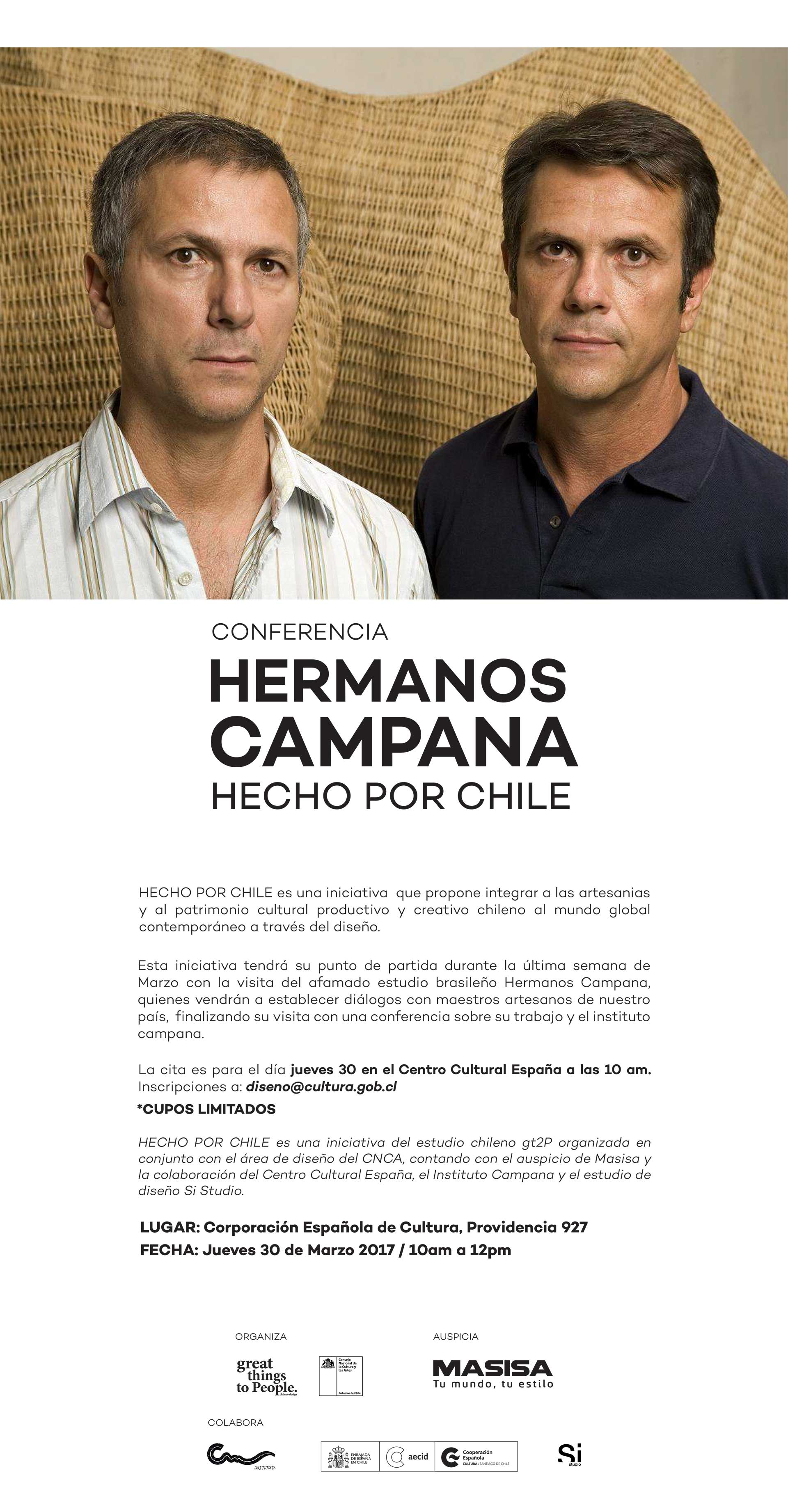 En su regreso a Santiago, Fernando y Humberto Campana expondrán sus experiencias con los Sellos de Excelencia Artesanía, además del trabajo que han desarrollado alrededor del mundo y en el Instituto Campana. El encuentro se realizará el jueves 30 de marzo, a las 10.00 horas, en el Centro Cultural España.