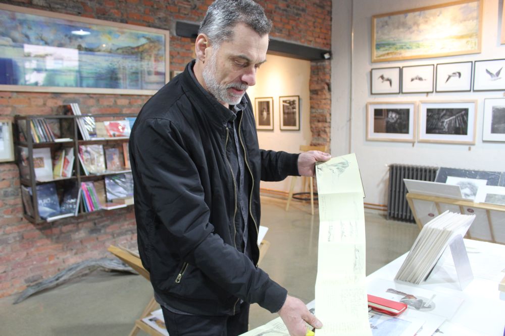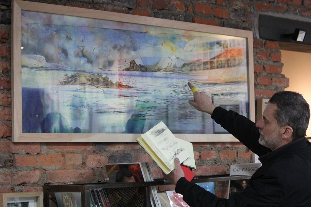 “Derroteros iluminados”, cuyo nombre responde –según explica su autor- a la hoja de ruta del navegante, a la luz de los faros y técnicamente a la aplicación de acuarela que otorga color al grabado, incluye una serie de piezas, de ellas, cinco estuvieron en España en exhibición, en Museo Marítimo de Barcelona, entre diciembre y febrero pasado. Ahora serán apoyo gráfico para su ponencia en la que contará su experiencia artística como magallánico y la producción creativa en el territorio.