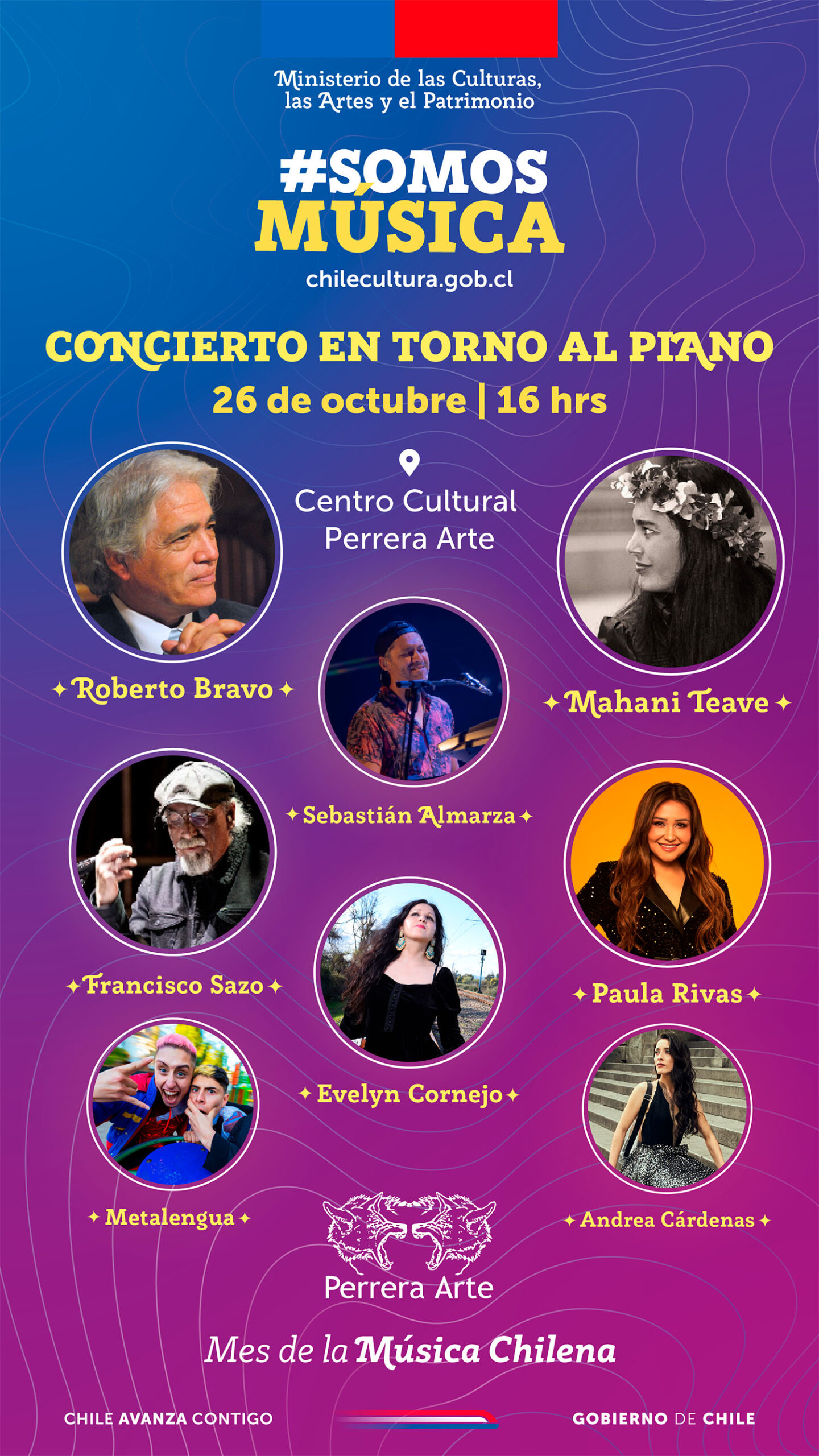 Con el piano como protagonista de la jornada, este domingo 26 de octubre se realizará en el frontis del Centro Cultural PerreraArte, en el Parque de los Reyes de Santiago, el concierto de cierre de la celebración del Mes de la Música Chilena, impulsado por el Ministerio de las Culturas, las Artes y el Patrimonio.