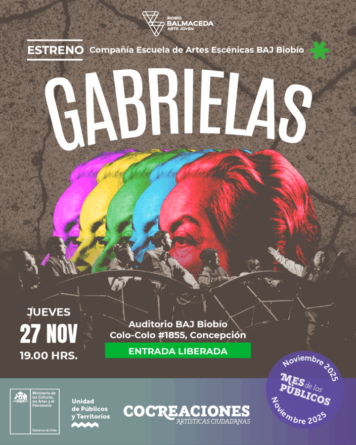 Al respecto, la seremi de las Culturas, las Artes y el Patrimonio del Biobío, Paloma Zúñiga, señaló que “el trabajo de Balmaceda Arte Joven ha sido clave para que muchas y muchos jóvenes se encuentren con la creación escénica y con la literatura nacional. Este remontaje de Gabrielas es una oportunidad para volver a mirar a Mistral desde las preguntas y sensibilidades de las nuevas generaciones, acercando su obra a nuevos espectadores en el marco del Mes de los Públicos”.