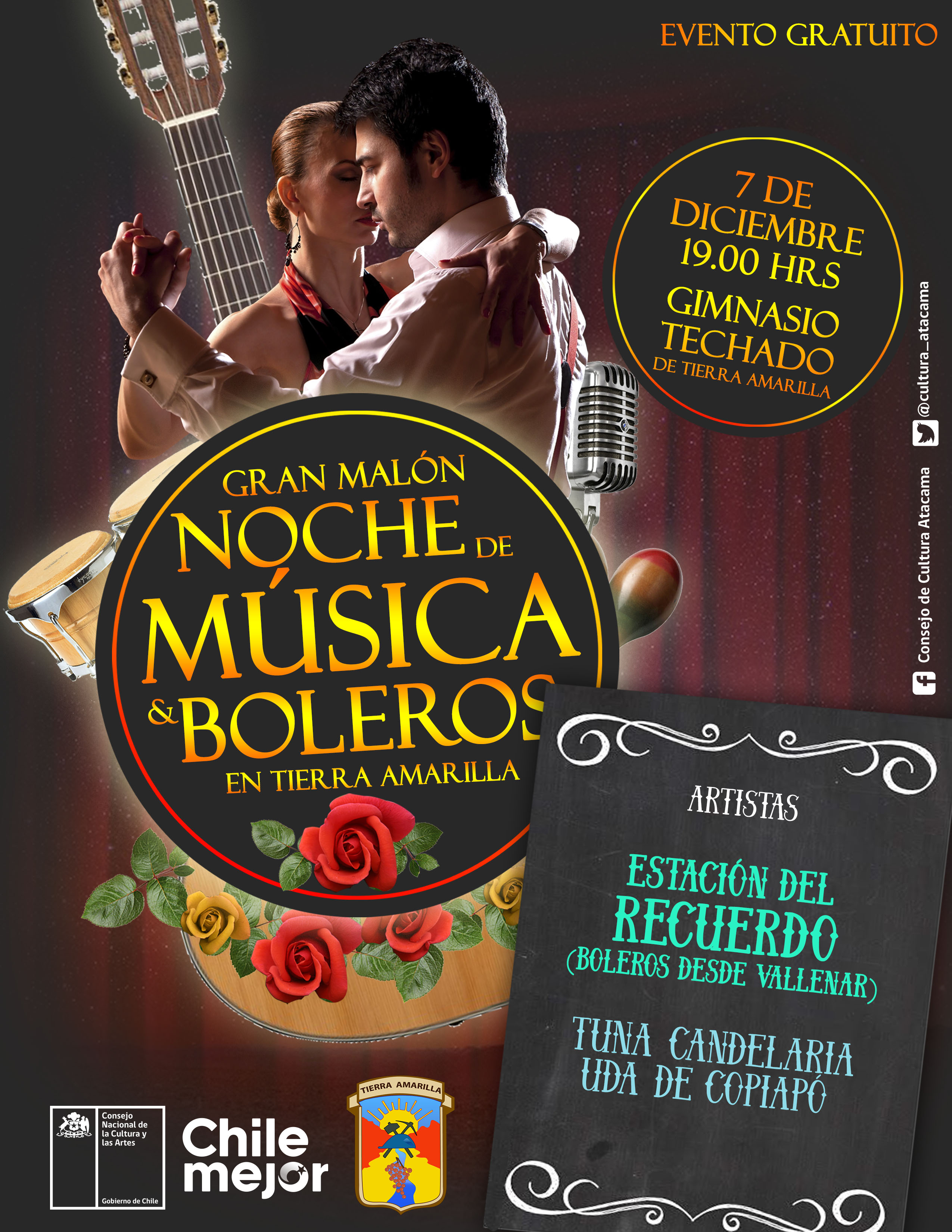 La noche de este jueves será inolvidable, porque se espera que la ciudadanía disfrute en pleno de un espectáculo lleno de recuerdos. Se trata del “Gran Malón, música y boleros en Tierra Amarilla”, actividad que reunirá en el Gimnasio Techado de la comuna a los grupos Estación del Recuerdo, de Vallenar; y Tuna Candelaria, de Copiapó, ofreciendo a la comunidad un espectáculo musical único y gratuito.