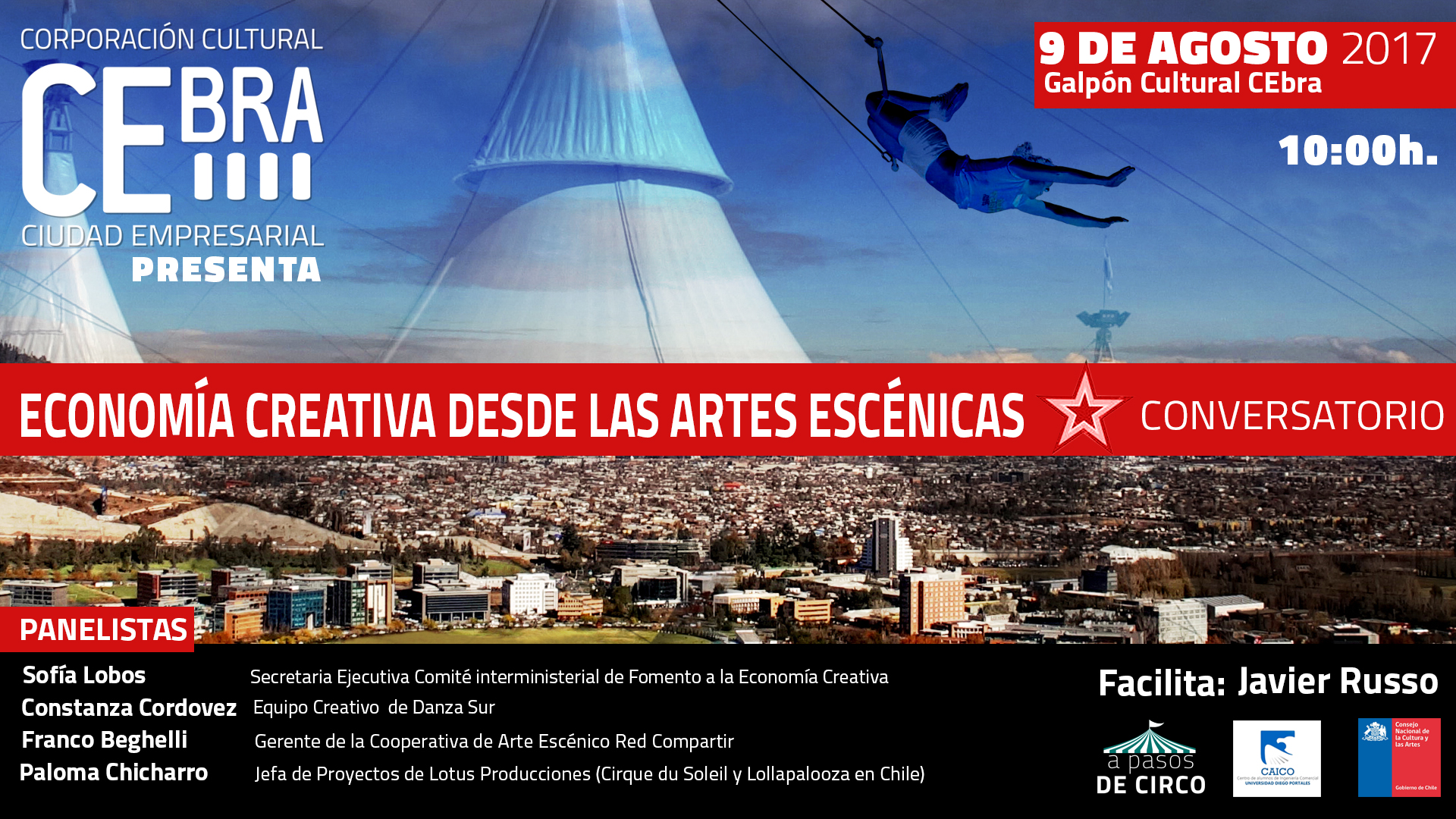La Corporación Cultural CEbra y el Área de Artes Circenses del Consejo Nacional de la Cultura y las Artes, invitan a participar en el Conversatorio de Economía Creativa desde las Artes Escénicas, a realizarse el próximo miércoles 9 de agosto, de 10:00 a 13:00 horas, en el Galpón Cultural CEbra ubicado en Palacio Riesco #4441, Ciudad Empresarial.