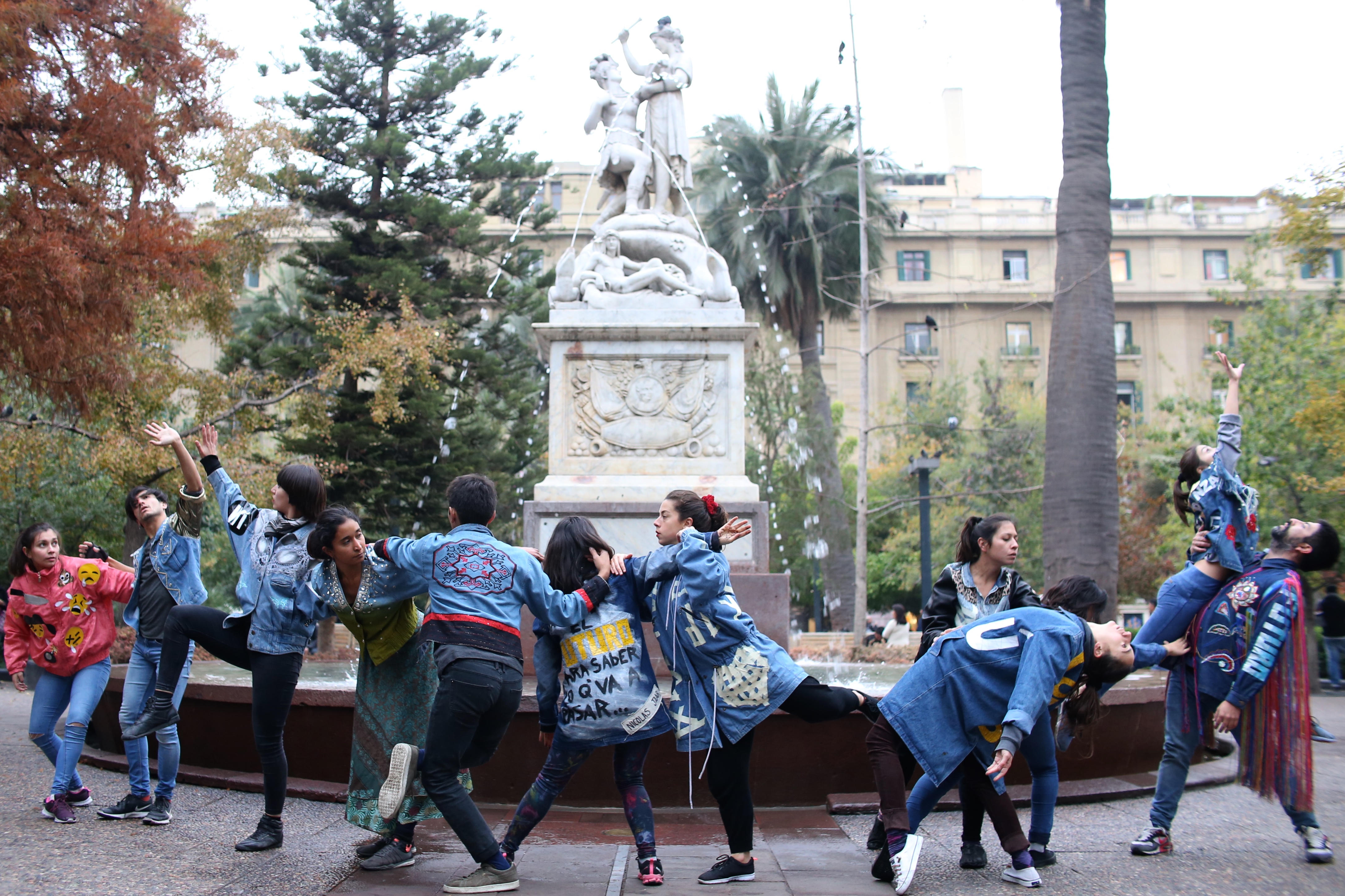 “No hay un tema específico, ni secuencias de movimientos fijadas. Escogimos elementos versátiles para trabajar en la calle, como el masking tape para escribir palabras, definir espacios y crear diferentes escenarios; parlantes portátiles que nos permiten amplificar el rango de impacto sonoro; y las palomas, como elemento vivo, que son parte del entorno en cada plaza de armas de Chile”, dice Bagnara para definir la propuesta.
