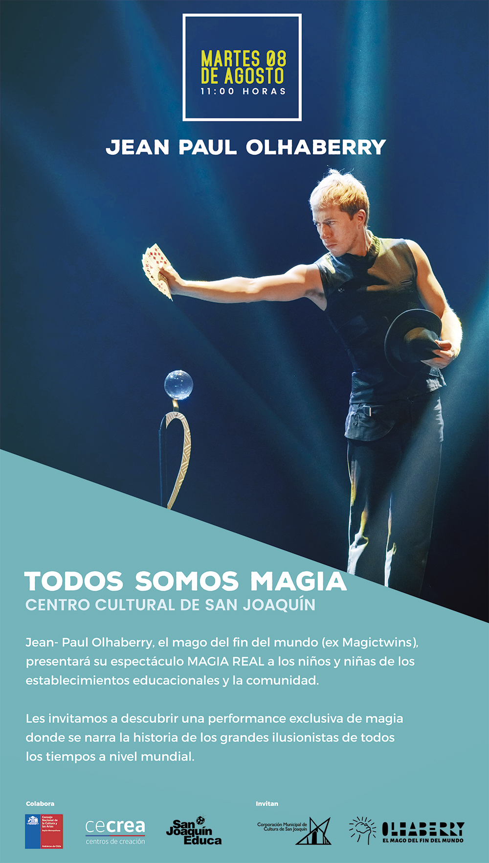 Considerado uno de los magos más importantes del país, con más de 10 años de experiencia y con ocho premios internacionales, Jean Paul Olhaberry, ex Magic Twins, sorprenderá a niños y niñas de establecimientos educaciones y la comunidad de San Joaquín, con su espectáculo “Magia Real”, el cual se presentará el próximo 8 de agosto a las 11:00 hrs. en el Centro Cultural San Joaquín.