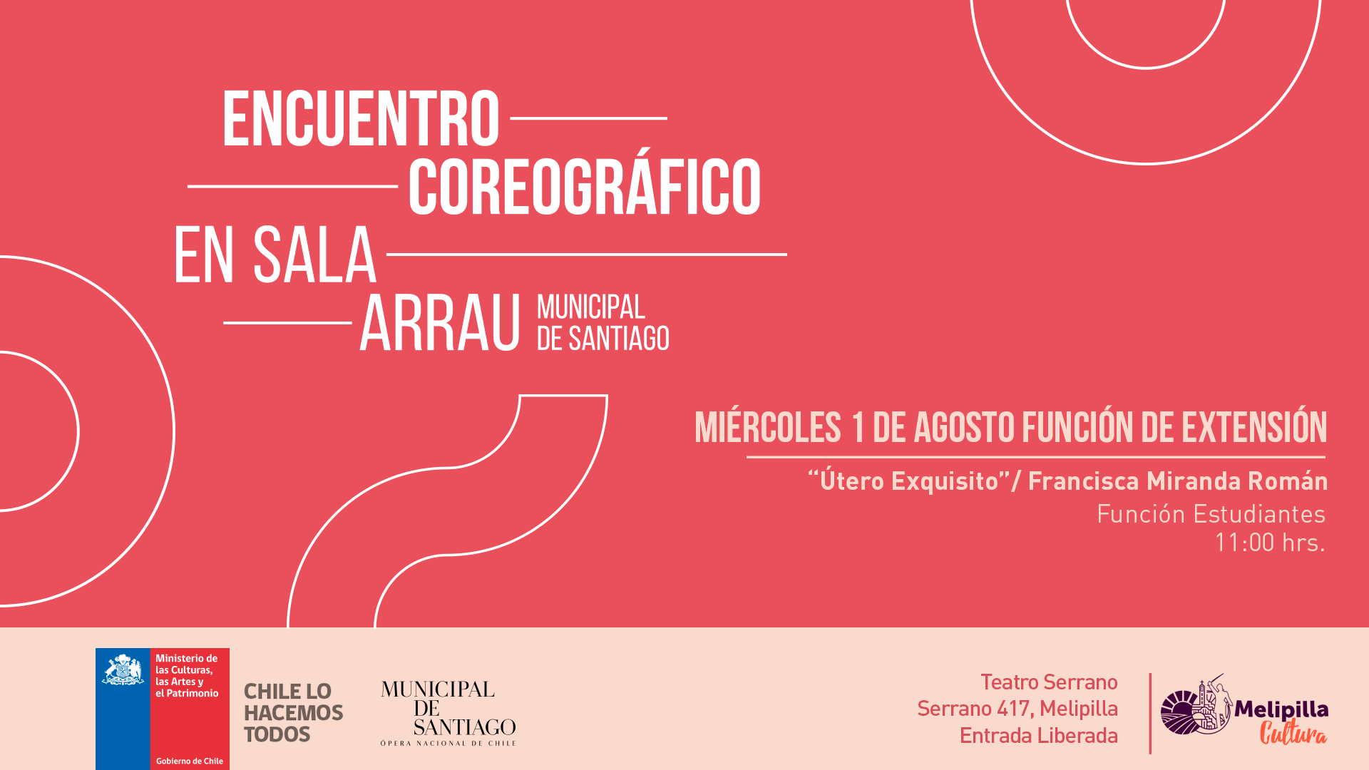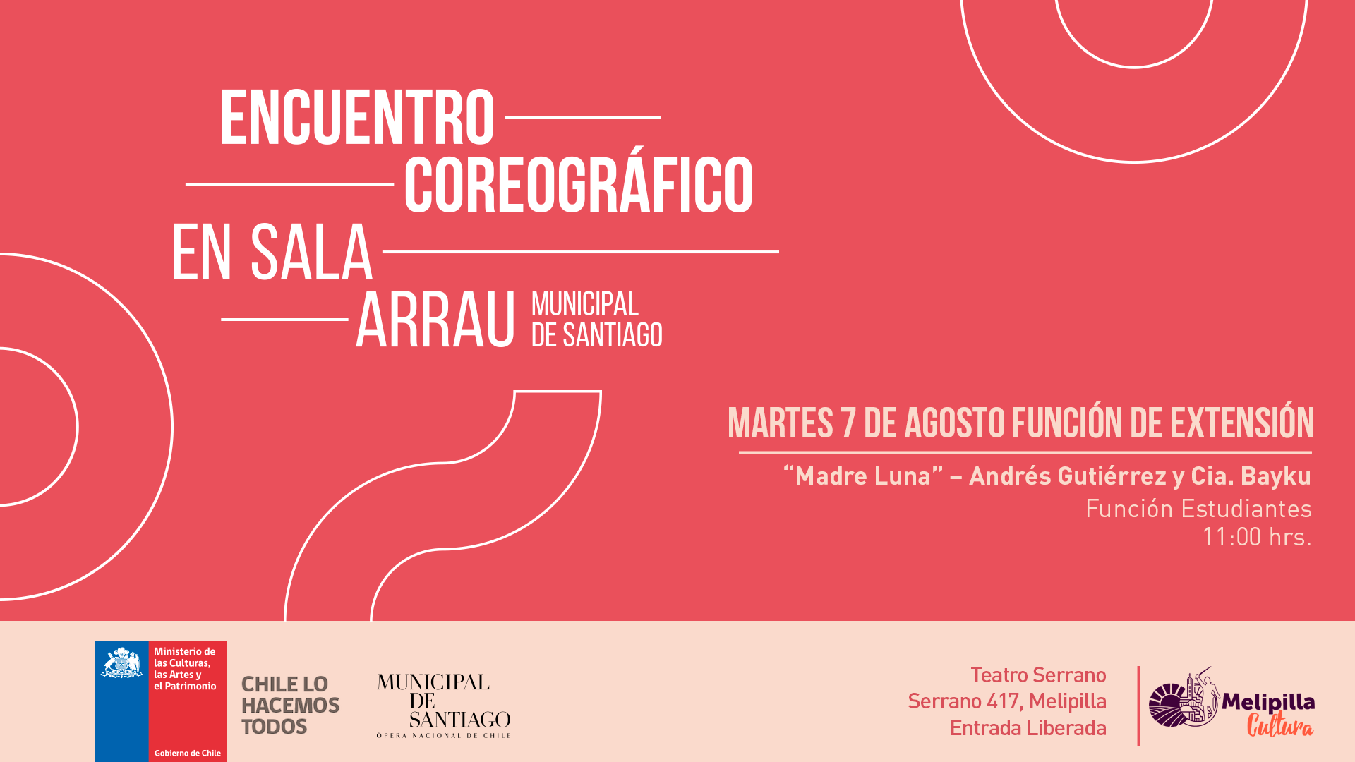 El 7 Encuentro Coreográfico Sala Arrau, ciclo impulsado por el Ministerio de las Culturas las Artes y el Patrimonio, a través de su área de Danza, y en colaboración con el Municipal de Santiago, Ópera Nacional, realizará actividades de extensión en las comunas de Melipilla y Lo Prado.