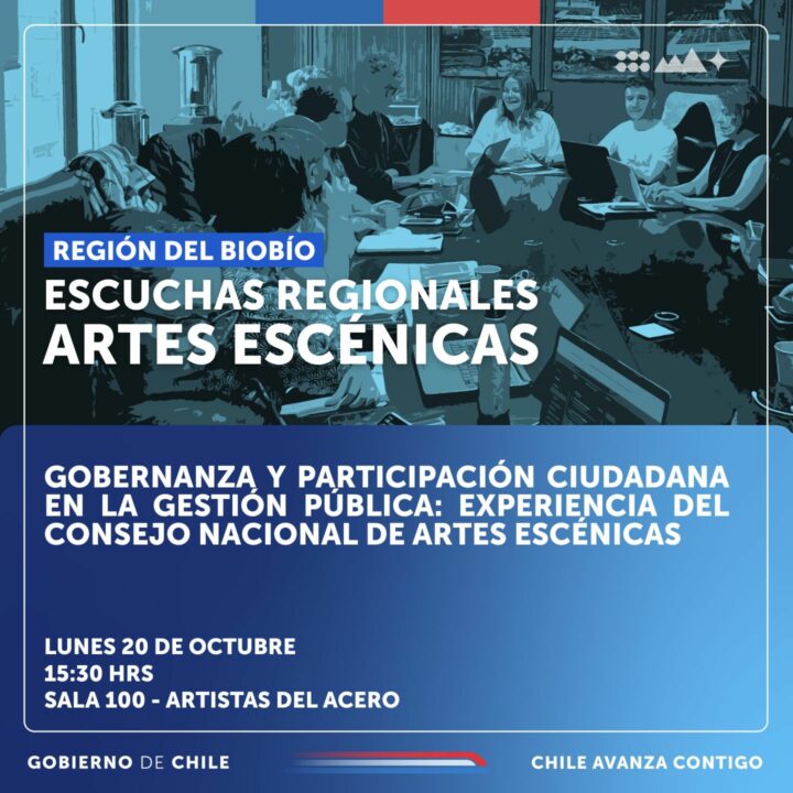 La Secretaría Ejecutiva de Artes Escénicas y el Consejo Nacional de Artes Escénicas, en coordinación con la Seremi de las Culturas, las Artes y el Patrimonio de la Región del Biobío, convocan a creadoras, creadores y agentes culturales del sector a participar en la jornada de Escuchas Regionales, un espacio de encuentro y reflexión sobre los desafíos actuales y futuros de las artes escénicas en el territorio.