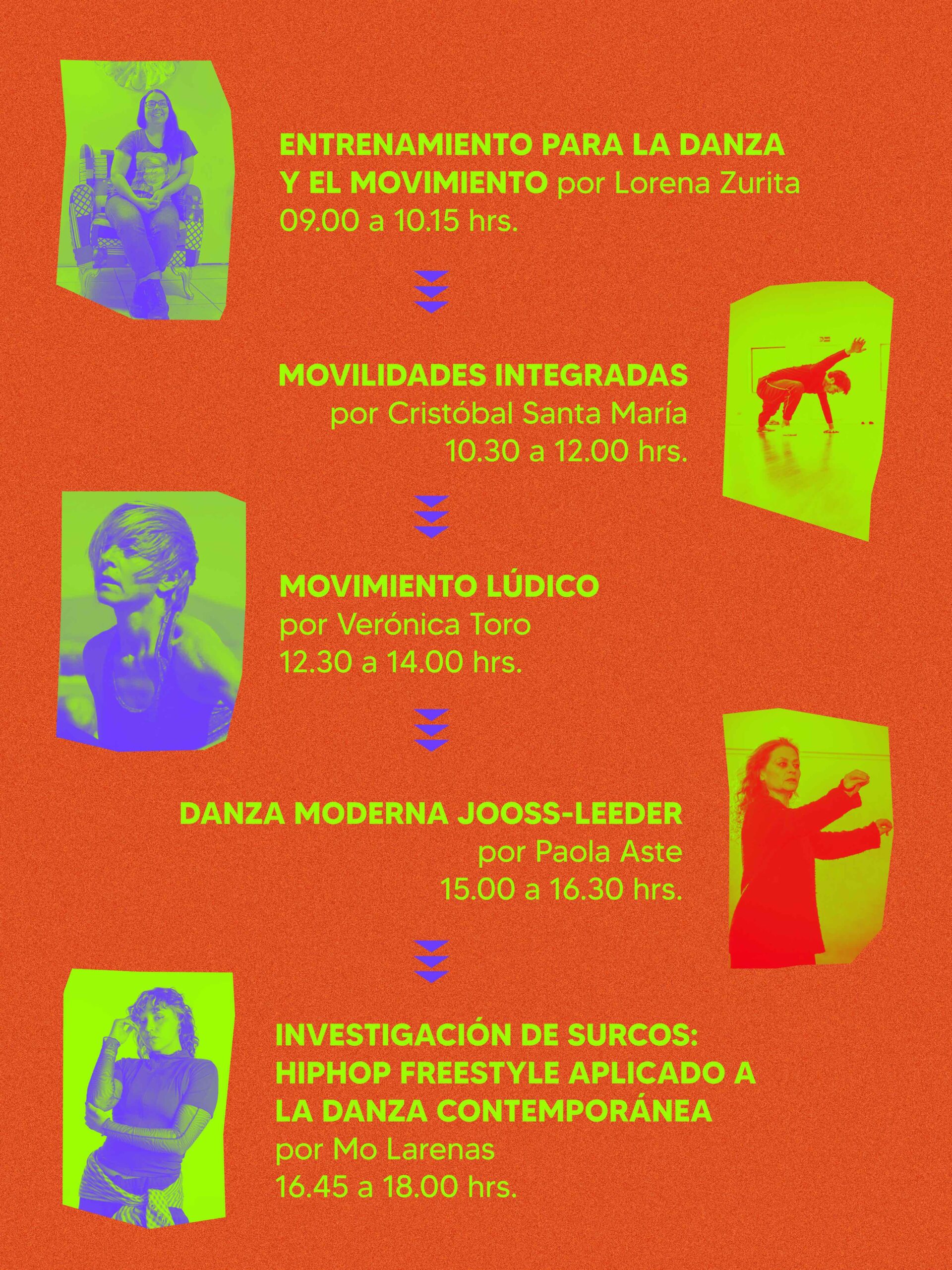 Durante este año se contemplan residencias con Rafael Silva (Puerto Montt), Ana Garat (Argentina), Pedro García (México) y Pseudónimo Cía. (Santiago), además de workshops a cargo de Exequiel Gómez (Santiago) y Lucas Condro (Argentina). En el ámbito de los entrenamientos, el programa contará con la participación de artistas regionales como Nerea Polymeris, Darwin Elso, Sebastián Chandía, Daniela Pérez y Chispi Torres.