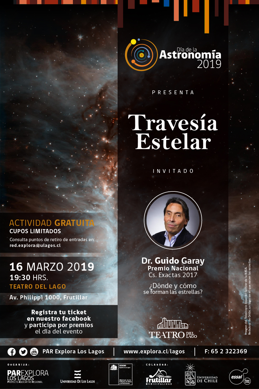 La actividad contará con la presencia del destacado astrónomo y Premio Nacional de Ciencias Exactas 2017, Guido Garay quién presentará su charla “Dónde y cómo se forman las estrellas” por medio de una macro proyección audiovisual con música ambiental, una jornada que contempla además un espectáculo artístico y una intervención con el público asistente.