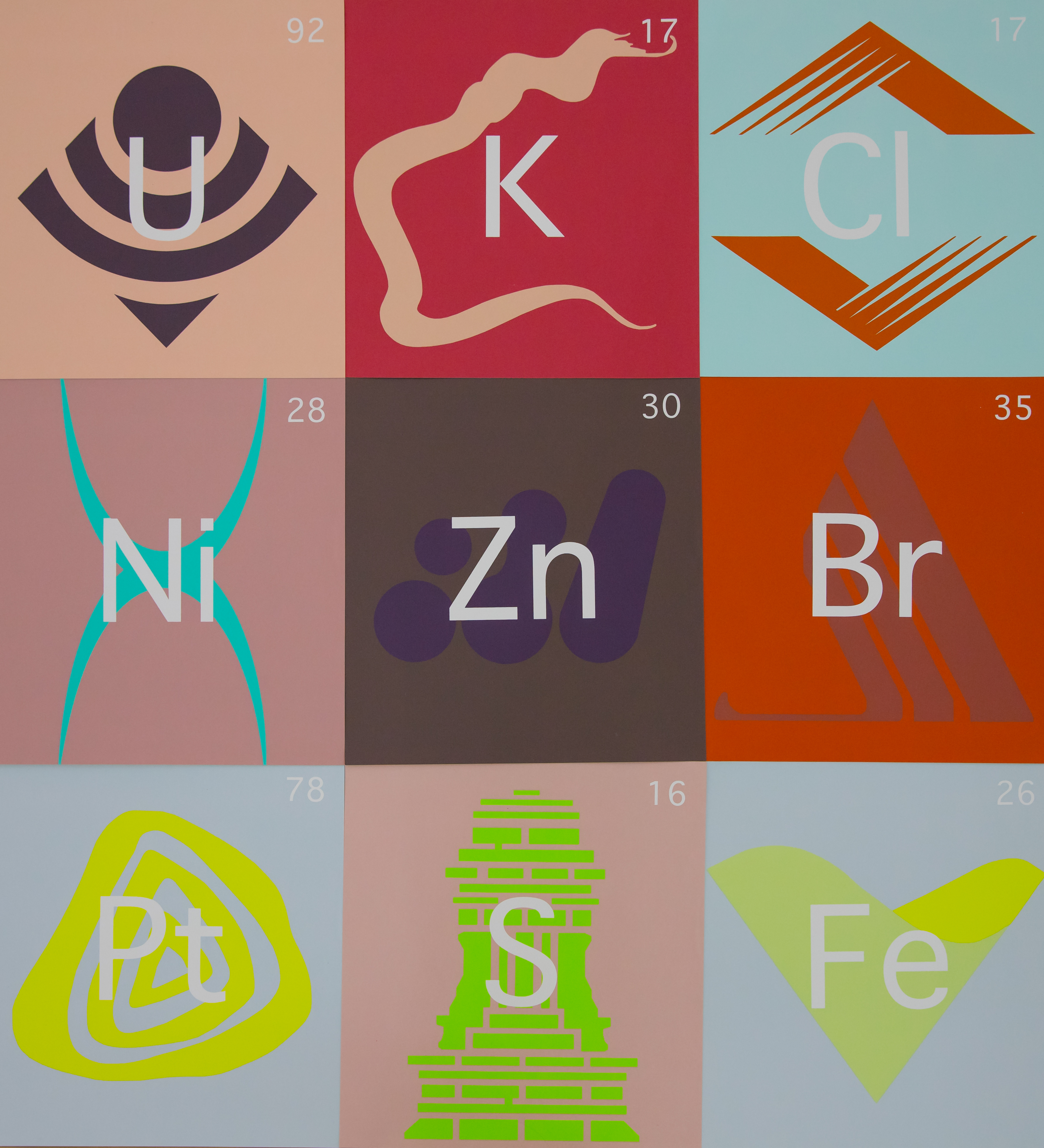 “En estas serigrafías vemos algunos símbolos de la tabla periódica junto a los logos de las compañías que los extraen. La traducción de la materia y las empresas en símbolos, los transforman en signos abstractos que alejan la cadena productiva de nosotros. La paleta de colores de las serigrafías proviene de una pequeña foto satelital que muestra las piscinas de litio de la empresa SQM, en el salar de Atacama en Chile”, añade la artista.