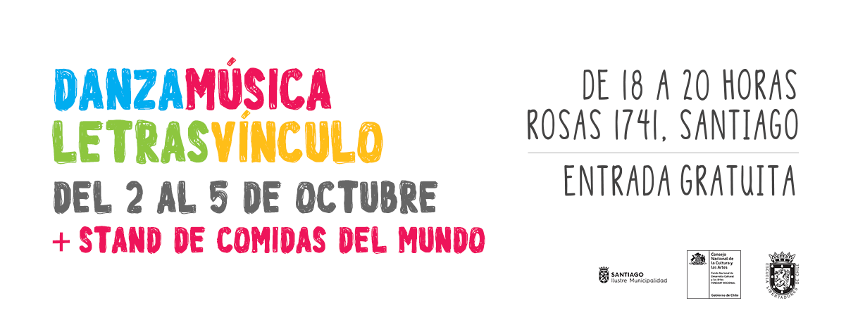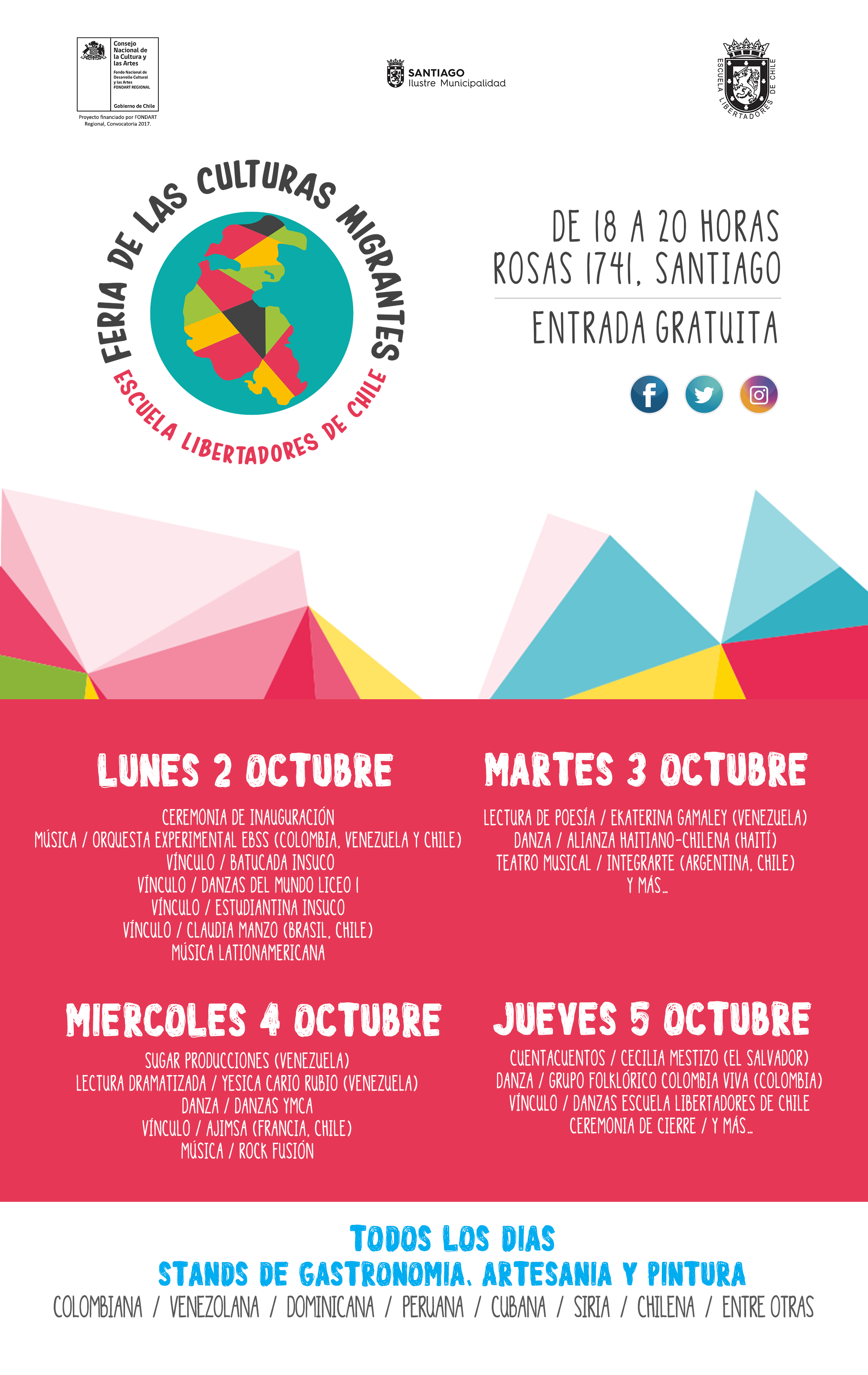 La Escuela Libertadores de Chile de la Municipalidad de Santiago y la Organización de FECUMI 2017 invitan a la Feria de las Culturas Migrantes, FECUMI 2017 a realizarse los días 2, 3, 4 y 5 de octubre de 2017 entre las 18:00 y las 20:00 horas en la escuela Libertadores de Chile, ubicada en Rosas 1741 (Metro Santa Ana). La instancia propone la difusión de artistas y agrupaciones culturales migrantes, o que trabajen en vínculo con ellos, en un evento que ponga al público en contacto con su trabajo para el levantamiento de una comunidad diversa, inclusiva y fraterna. Este evento es absolutamente gratuito.