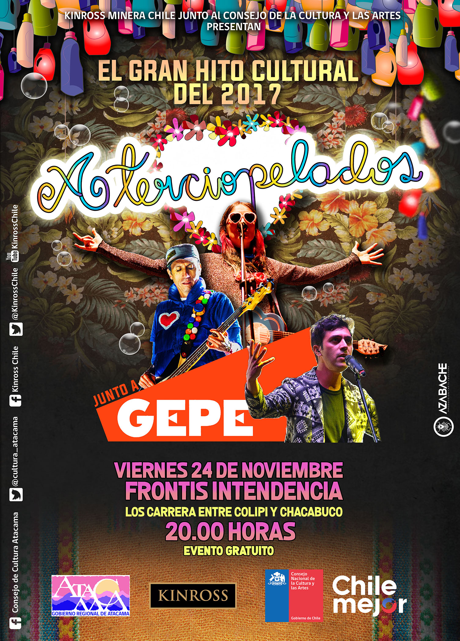 Con el propósito de mantener el acceso ciudadano a eventos culturales de alto nivel y gracias a la colaboración público privada, el Consejo de la Cultura y las Artes de Atacama, el Gobierno Regional de Atacama y Minera Kinross, presentarán a Gepe y Aterciopelados, en concierto.