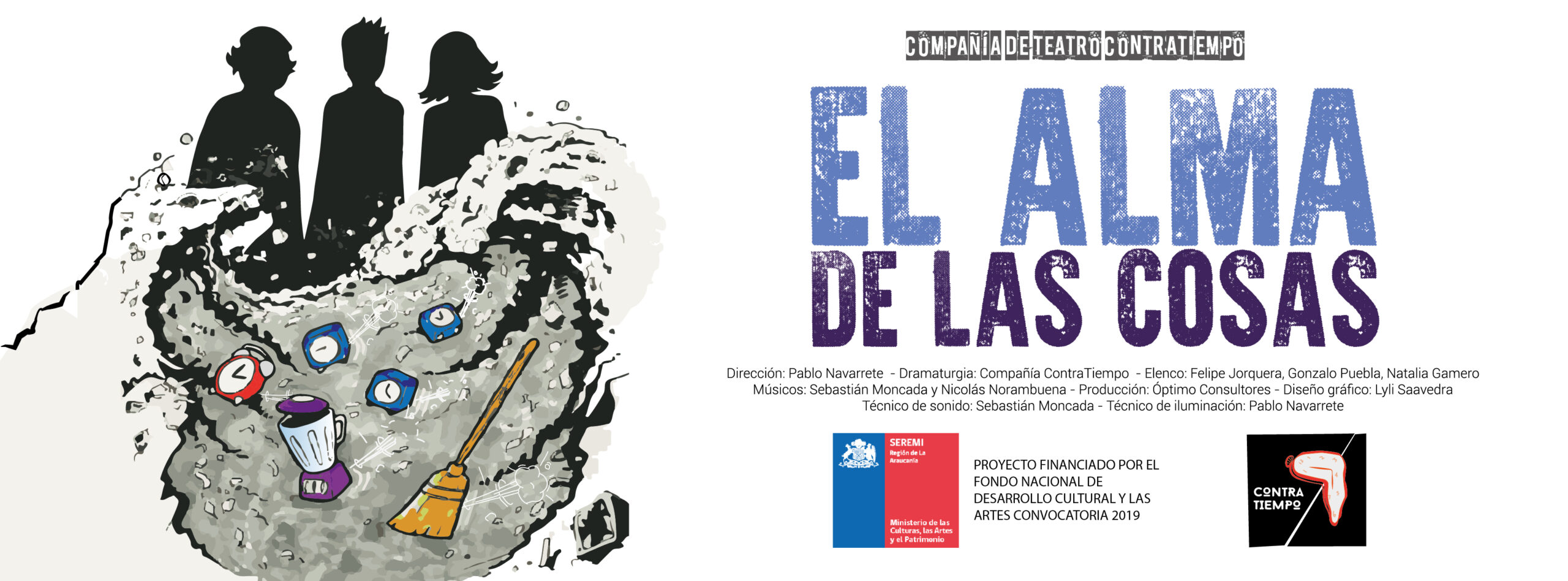 Tras más de treinta funciones en establecimientos educativos de la comuna de Temuco, Valdivia y Panguipulli, la compañía temuquense, Contratiempo, mantiene su apuesta y compromiso con el público infantil regional con una nueva gira de la obra teatral “El Alma de las Cosas”. Este proyecto financiado por el Ministerio de las Culturas, las Artes y el Patrimonio a través del Fondo Nacional de Desarrollo Cultural y las Artes Convocatoria 2019, se presenta como una propuesta para potenciar el acceso a las artes y la cultura hacia distintas comunas periféricas de las regiones de La Araucanía y Los Ríos donde niñas, niños y sus familias podrán reflexionar junto a la compañía sobre el proceso de creación artística de la obra y la temática medioambiental.