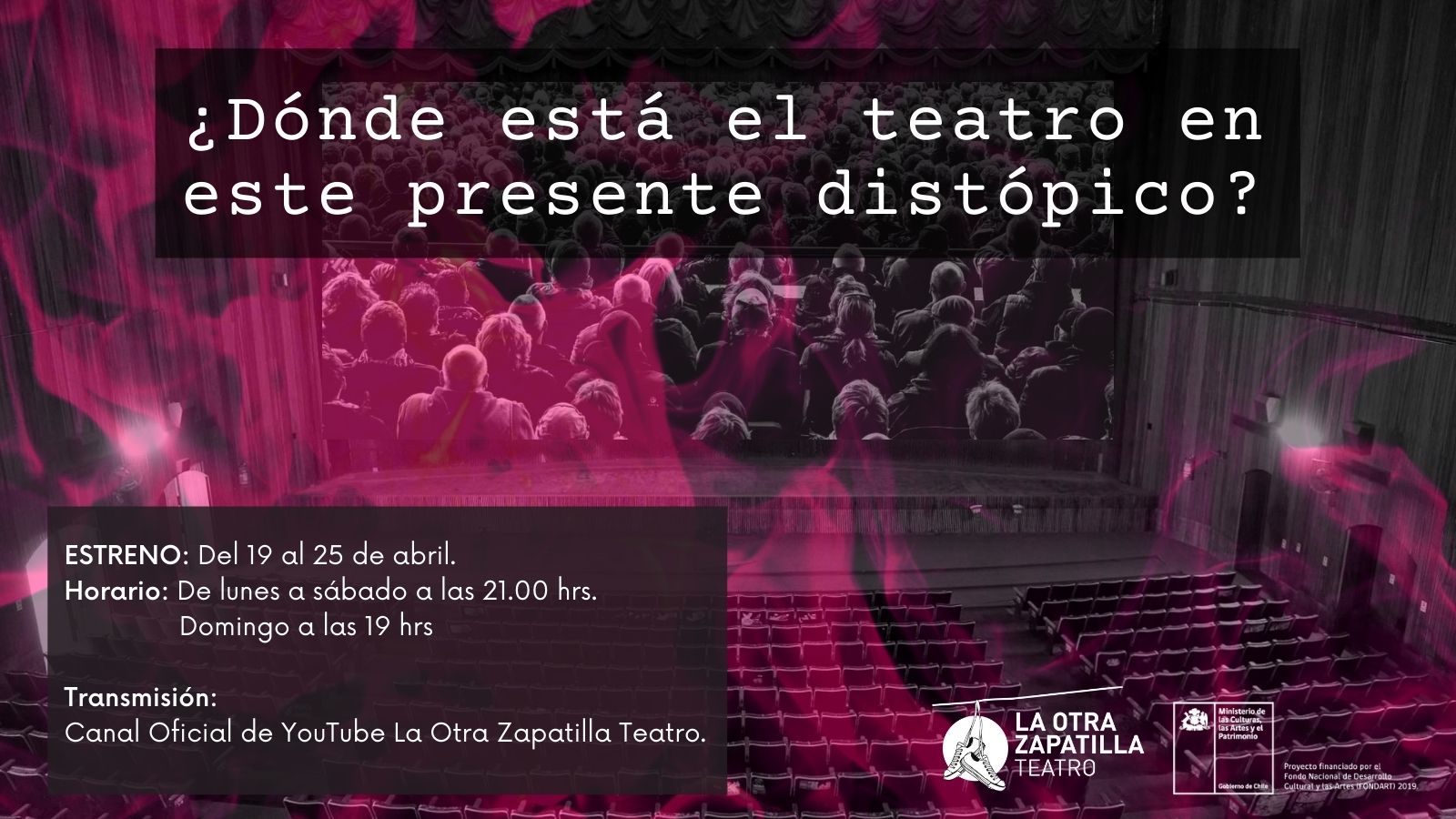 En esta época de pandemia, las artes escénicas transitan por una desmesurada realidad que ha llevado a que muchos artistas se reinventen o exploren nuevas posibilidades. Es así como lo digital y audiovisual se ha convertido en el escenario, no tan ideal, para que el arte siga vivo de la mano de quienes mantienen algún proyecto escénico y creativo. Patricia Cabrera, actriz y participante de este proceso, comenta que al iniciar este proyecto, en medio de la pandemia, fue posible profundizar sobre el lugar en que se encuentra el teatro hoy en día. “Esto nos dio la premisa de que este es un presente distópico para nuestro oficio, de ahí comienza esta investigación que es sobre dónde nos encontramos ahora con el teatro, donde lo vemos, dónde está, cómo lo sentimos. De qué manera se hace presente, de qué manera nos conectamos con él y no dejamos de encender su llama que abraza a tantas y tantos”, señala la actriz.