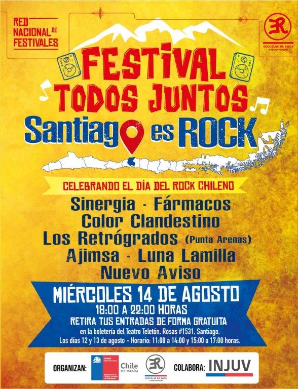 La Secretaría Regional Ministerial de las Culturas, las Artes y el Patrimonio de la Región Metropolitana, a través de su Programa Escuelas de Rock y Música Popular del Programa Fortalecimiento de la Identidad Cultural Regional, con la colaboración del Instituto Nacional de la Juventud de la RM celebran en el mes de agosto por primera vez el Día del Rock Chileno a través del “Festival Todos: Juntos Santiago es Rock” en el Teatro Teletón.