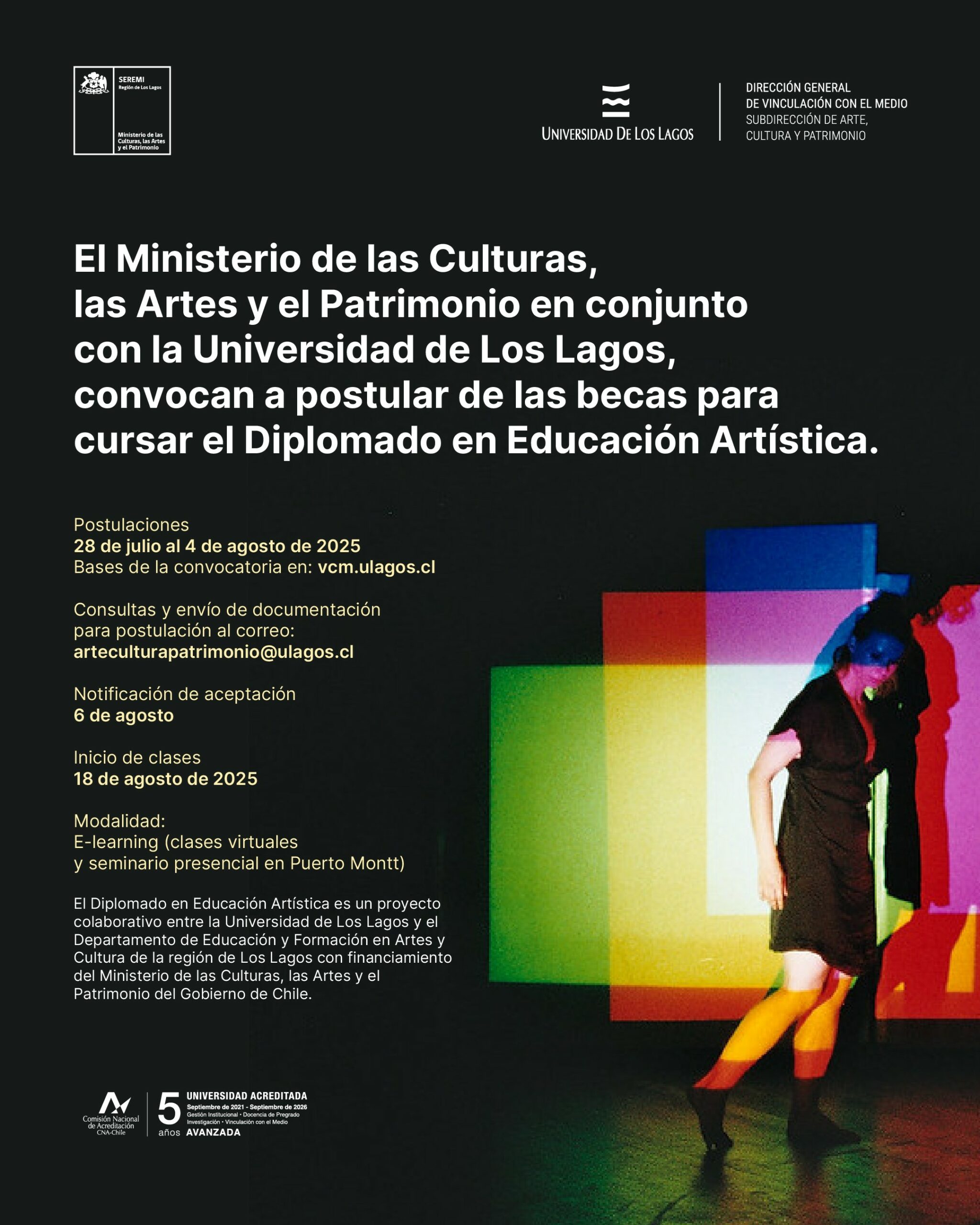 Las bases para las postulaciones las puedes encontrar en vcm.ulagos.cl y la postulación es hasta el 4 de agosto 2025. Con esta iniciativa, el Ministerio de las Culturas, las Artes y el Patrimonio, reafirma su compromiso con el desarrollo cultural sostenible en la región, potenciando la educación artística como un motor de transformación social y comunitaria.