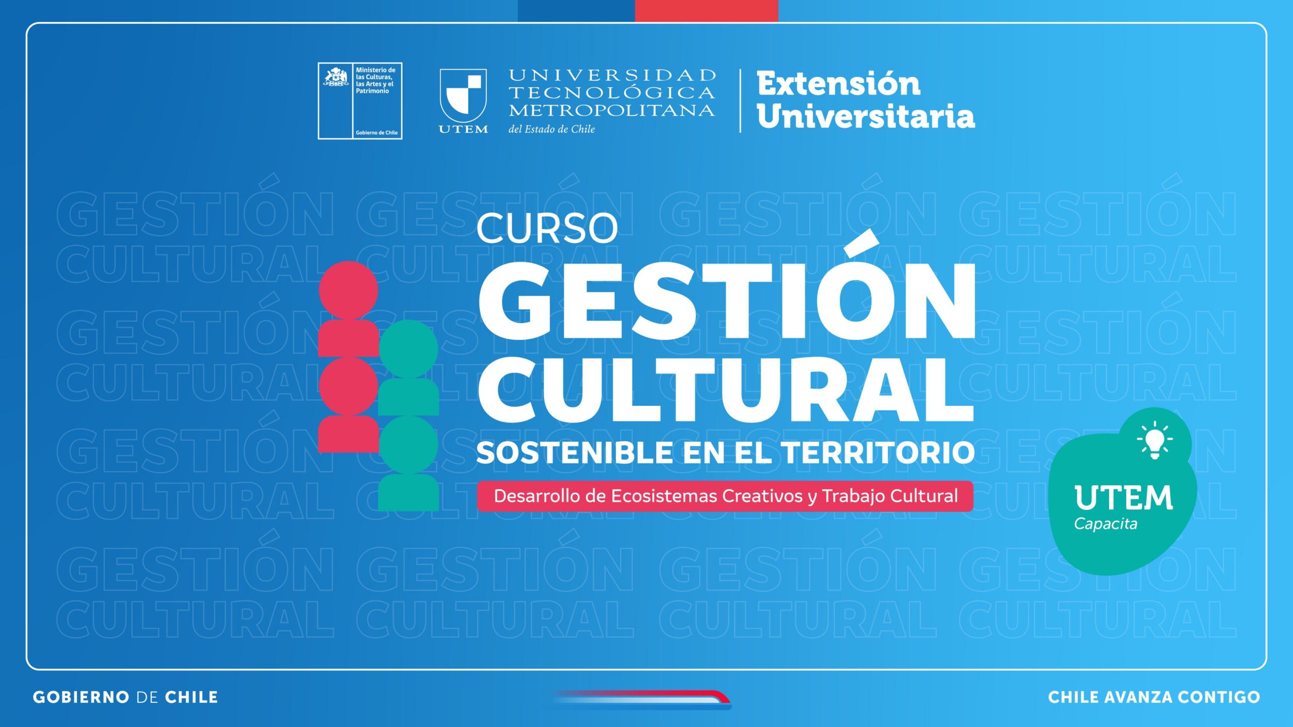 Este ciclo formativo es impulsado por el Ministerio de las Culturas, las Artes y el Patrimonio, a través del Programa Fomento y Desarrollo de Economías Creativas de la Secretaría Ejecutiva de Economía Creativa, y el Programa Promoción y Fortalecimiento del Trabajo Cultural, quienes en conjunto con la Dirección de Extensión de la UTEM llevarán a cabo el Curso “Gestión Cultural Sostenible en el Territorio. Desarrollo de Ecosistemas Creativos y Trabajo Cultural”. Este curso será desarrollado bajo la línea programática ‘UTEM Capacita’, la cual forma parte del área de Extensión de la Vicerrectoría de Transferencia Tecnológica y Extensión de la Universidad Tecnológica Metropolitana.