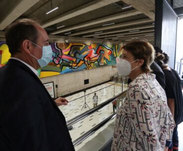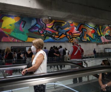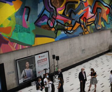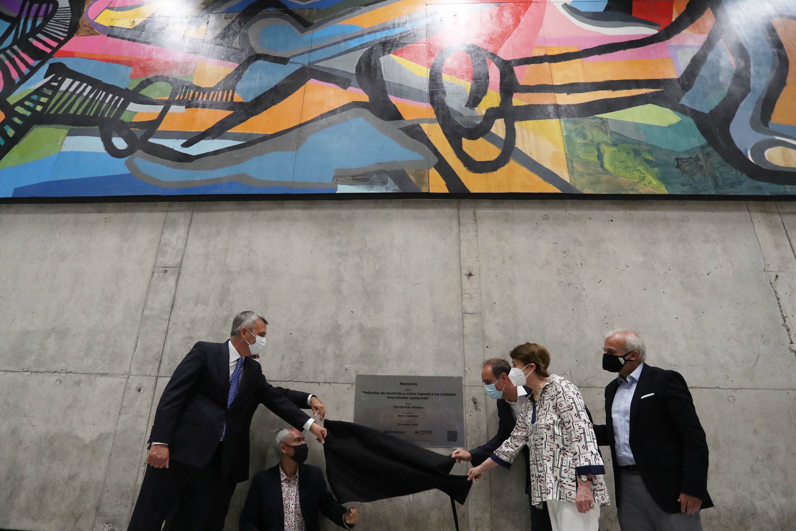 La ministra de las Culturas, las Artes y el Patrimonio, Consuelo Valdés; el subsecretario de Transportes, José Luis Domínguez; junto al presidente de Metro, Louis de Grange; el Presidente del Banco Santander, Claudio Melandri y el artista Ciro Beltrán, presentaron este lunes el mural “Poblados de recorrido o cómo ingresé a las ciudades amuralladas zumbando”, iniciativa que forma parte de la reactivación del programa MetroArte, que tiene como fin potenciar el arte público, enriqueciendo y dando identidad a las estaciones.