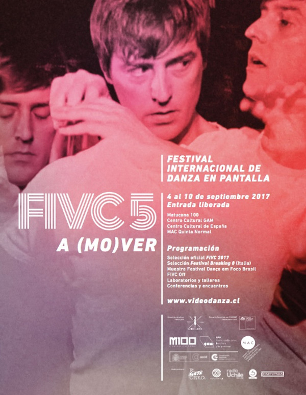 En la ciudad de Santiago, entre el 4 y el 10 de septiembre, se llevará a cabo el 5º Festival Internacional de Danza en Pantalla Chile, FIVC 2017. Su nutrida agenda de actividades se desarrollará en M100, MAC (Museo de Arte Contemporáneo), GAM y CCE (Centro Cultural de España), y contempla 600 minutos de piezas de cine de danza, videodanza y documental, ocho conferencias, tres talleres, además de encuentros, laboratorios y diálogos entre creadores del arte del video-cine danza y el público. Todas las actividades son gratuitas y de acceso libre.