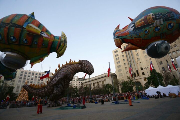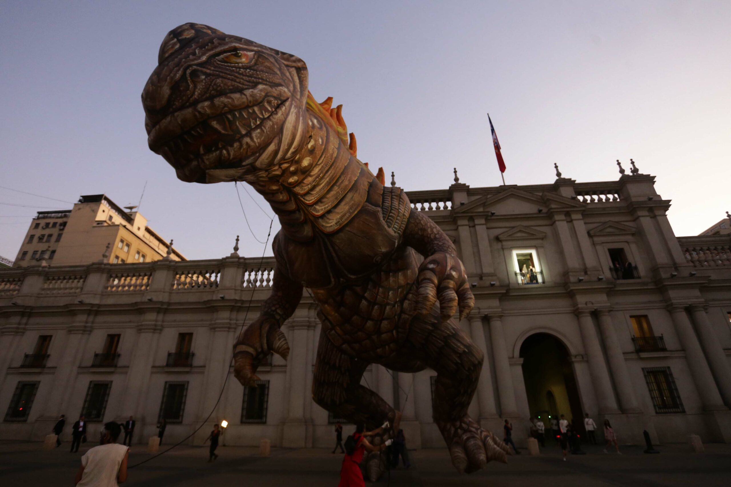Desde el balcón del Palacio de las Moneda el Presidente de la República, Gabriel Boric, junto a la ministra de las Culturas, las Artes y el Patrimonio, Julieta Brodsky; la directora Ejecutiva de Fundación Teatro a Mil, Carmen Romero, y el vicepresidente de Asuntos Corporativos de Escondida BHP, René Muga, dieron el puntapié inicial al Festival Teatro a Mil 2023, con el despliegue de Saurian y los testigos del espacio exterior. El pasacalle consideró un dinosaurio de casi 15 metros de alto, acompañado de naves especiales, que transitaron desde la Plaza de la Constitución y parte de la Alameda, congregando a cientos de personas en las calles.