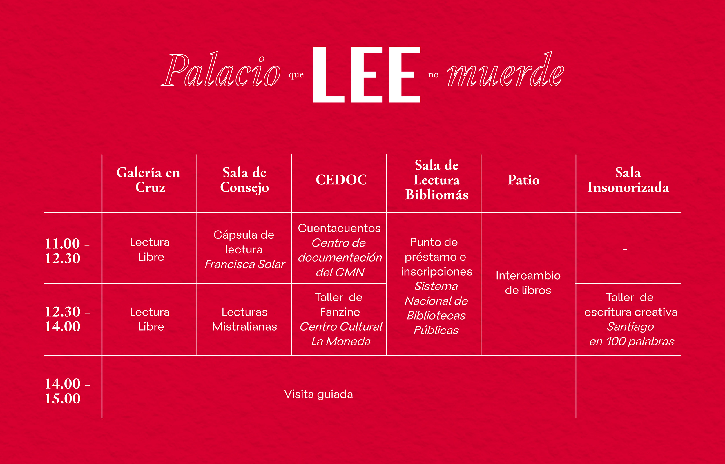 - Taller de escritura creativa junto a la Fundación Plagio (12:30-14:00): Un espacio que invita a escribir relatos y participar en la XXIV versión de Santiago en 100 Palabras, fomentando la inspiración, la escritura y el Cupos limitados. Inscripción previa en el perfil de Palacio Pereira en Instagram.